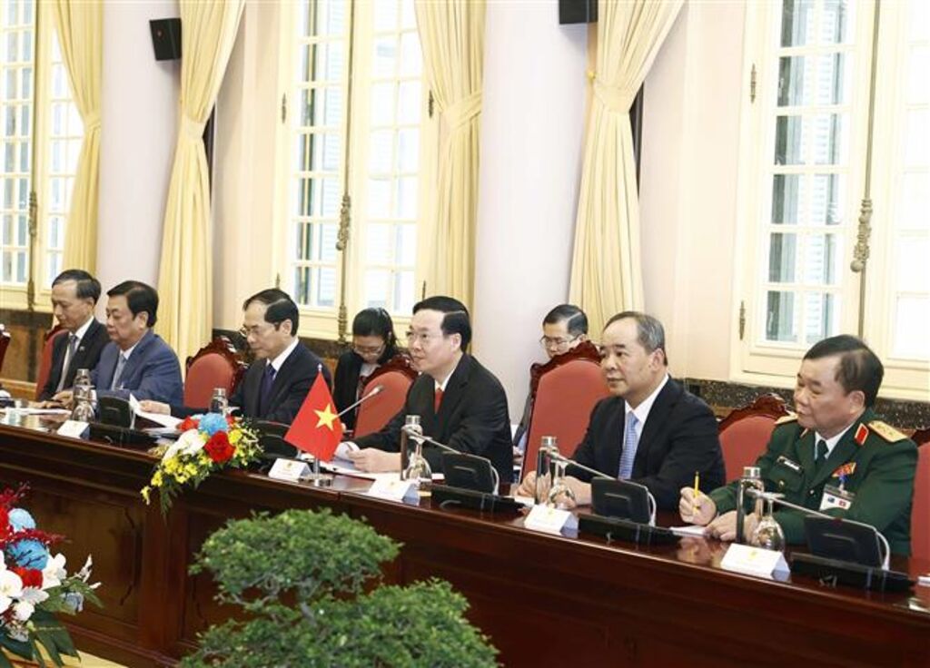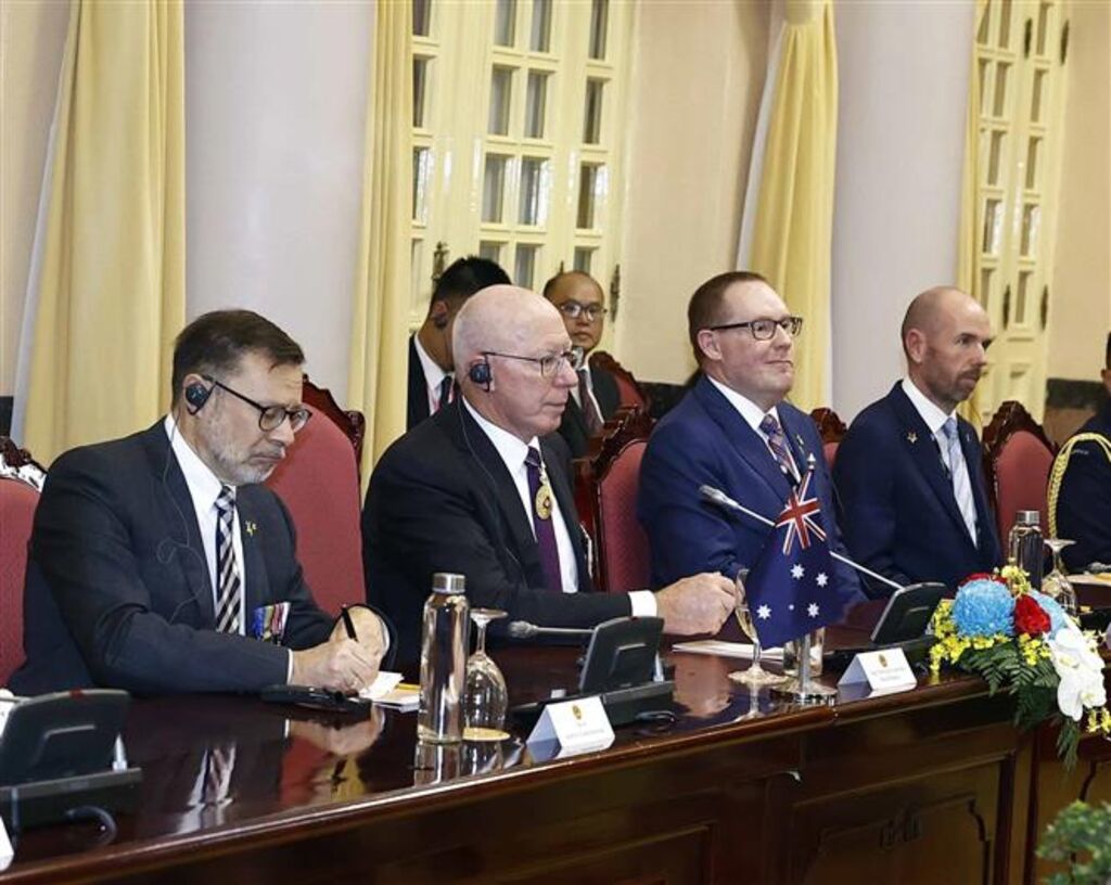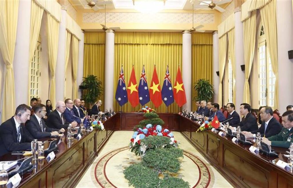TTXVN - Sáng 4/4, ngay sau lễ đón chính thức, tại Phủ Chủ tịch, Chủ tịch nước Võ Văn Thưởng đã hội đàm với Toàn quyền Australia David Hurley (Đây-vít Hơ-li).