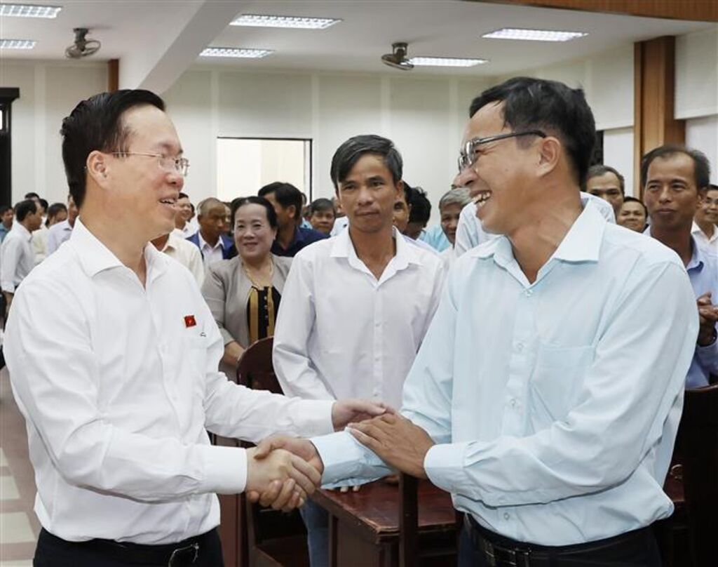 TTXVN - Ngày 5/12, tại huyện Hòa Vang, Chủ tịch nước Võ Văn Thưởng và Đoàn Đại biểu Quốc hội thành phố Đà Nẵng đã dự Hội nghị tiếp xúc cử tri để thông báo kết quả Kỳ họp thứ 6, Quốc hội khóa XV; đồng thời ghi nhận, tiếp thu ý kiến của cử tri. Tại Hội nghị, cử tri đã nêu ra nhiều kiến nghị, đề xuất liên quan đến một số lĩnh vực được cử tri và người dân quan tâm như: Công cuộc phòng, chống tham nhũng, tiêu cực; việc khắc phục tình trạng thiếu thuốc và trang thiết bị y tế phục vụ công tác khám, chữa bệnh; bất cập trong phân luồng giáo dục Trung học cơ sở...