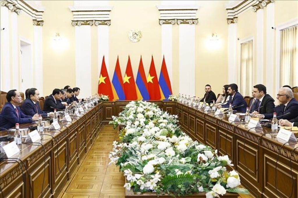 Chủ tịch Quốc hội Trần Thanh Mẫn bày tỏ vui mừng thay mặt Lãnh đạo Đảng, Nhà nước Việt Nam dẫn đầu Đoàn đại biểu cấp cao Quốc hội Việt Nam thăm chính thức Armenia tươi đẹp và giàu lòng mến khách, cảm ơn Chủ tịch Quốc hội Armenia, các lãnh đạo, đại biểu Quốc hội, nhân dân Armenia đã dành cho Chủ tịch Quốc hội và Phu nhân cùng Đoàn sự đón tiếp nồng hậu, trọng thị và chu đáo. Nhắc lại ý nghĩa chuyến thăm của Chủ tịch Hồ Chí Minh đến Armenia tháng 7/1959, Chủ tịch Quốc hội nhấn mạnh chuyến thăm lần này cùng chuyến thăm của Chủ tịch Quốc hội Armenia đến Việt Nam tháng 11/2024 sẽ tạo xung lực để Việt Nam và Armenia tiếp tục thắt chặt quan hệ hữu nghị, hợp tác giữa hai nước, hai dân tộc.