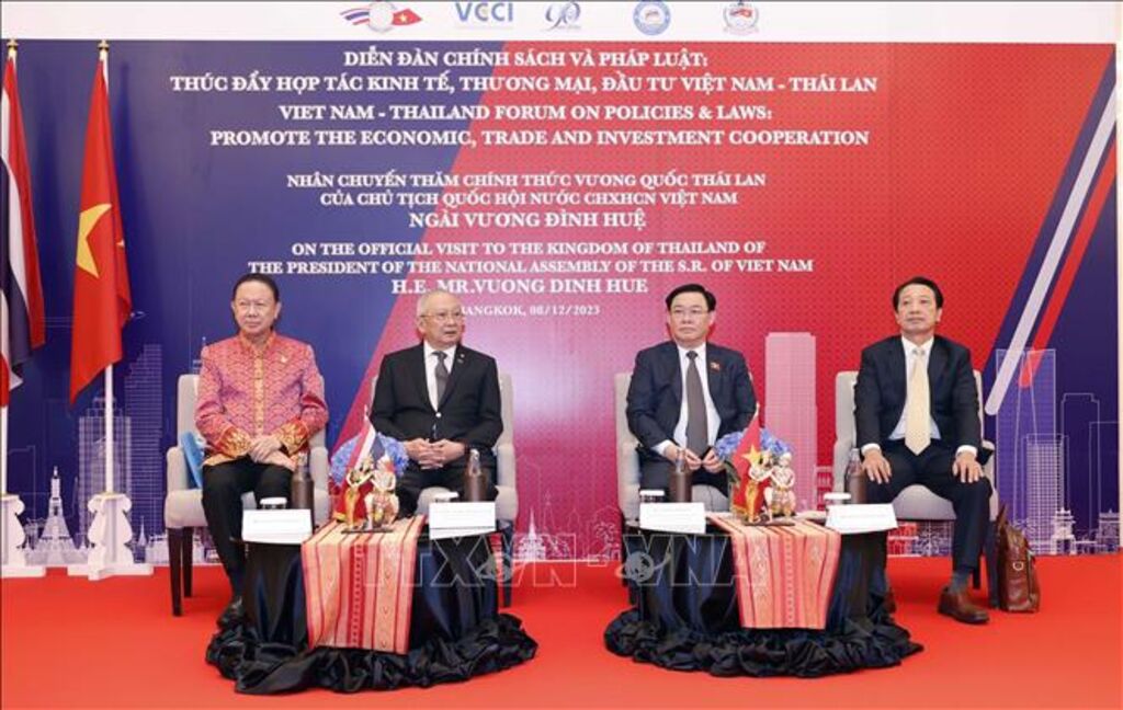TTXVN - Theo đặc phái viên TTXVN, trong khuôn khổ chuyến thăm chính thức Thái Lan, chiều 8/12, tại thủ đô Bangkok, Chủ tịch Quốc hội Vương Đình Huệ và Đoàn đại biểu cấp cao Quốc hội Việt Nam đã dự Diễn đàn chính sách và pháp luật thúc đẩy hợp tác kinh tế, thương mại, đầu tư Việt Nam - Thái Lan do Liên đoàn Thương mại và Công nghiệp Việt Nam (VCCI) phối hợp với Phòng Thương mại Thái Lan (TTC) và các cơ quan liên quan tổ chức. Cùng dự có Chủ tịch Nhóm Nghị sĩ hữu nghị Thái Lan - Việt Nam Sakchai Tanaboonchai; Chủ tịch Phòng Thương mại Thái Lan - Chủ tịch Hội đồng Thương mại quốc gia Thái Lan Sanan Angubolkul; Đại sứ Thái Lan tại Việt Nam Nikorndej Balankura; lãnh đạo các bộ, ngành của Thái Lan, Việt Nam và khoảng 300 doanh nghiệp.
