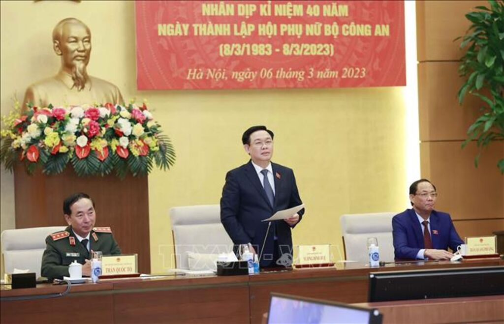 TTXVN - Chiều 6/3, tại Nhà Quốc hội, nhân kỷ niệm 113 năm Ngày Quốc tế Phụ nữ và 40 năm Ngày thành lập Hội Phụ nữ Bộ Công an (8/3/1983 – 8/3/2023), Ủy viên Bộ Chính trị, Chủ tịch Quốc hội Vương Đình Huệ đã gặp mặt Đoàn đại biểu các nữ anh hùng, nữ sĩ quan, nữ chiến sĩ lực lượng Công an nhân dân, đại diện các thế hệ cán bộ Hội Phụ Bộ Công an qua các thời kỳ.