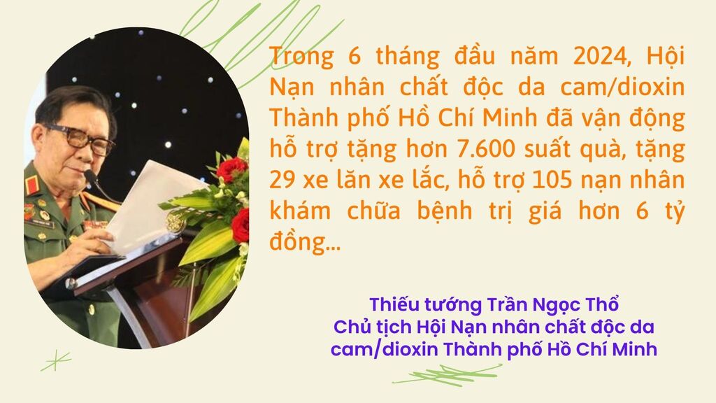 Thiếu tướng Trần Ngọc Thổ, Chủ tịch Hội Nạn nhân chất độc da cam/dioxin Thành phố Hồ Chí Minh chia sẻ: Kỷ niệm 63 năm Ngày thảm họa da cam ở Việt Nam là dịp để các cá nhân, tổ chức nhận thức vai trò trách nhiệm trước nỗi đau của nạn nhân, phát huy tinh thần tương thân tương ái, tiếp tục chung tay giúp đỡ họ về vật chất lẫn tinh thần. Trong 6 tháng đầu năm 2024, Hội Nạn nhân chất độc da cam/dioxin Thành phố đã vận động, tặng hơn 7.600 suất quà, tặng 29 xe lăn xe lắc, hỗ trợ 105 nạn nhân khám chữa bệnh trị giá hơn 6 tỷ đồng…