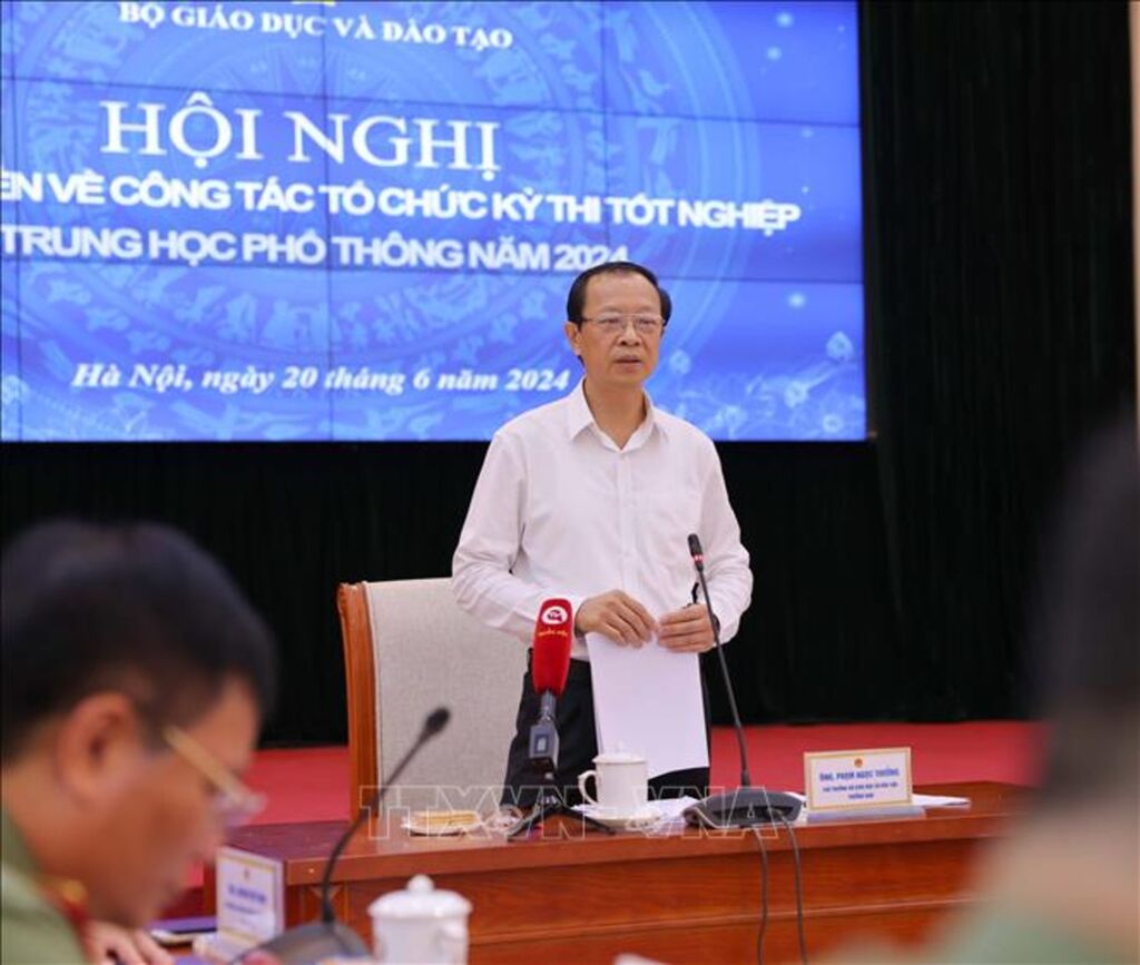 Phát biểu kết luận tại cuộc họp, Thứ trưởng Bộ Giáo dục và Đào tạo Phạm Ngọc Thưởng, Trưởng Ban chỉ đạo cấp quốc gia Kỳ thi tốt nghiệp Trung học Phổ thông năm 2024 đề nghị Ban chỉ đạo thi các tỉnh, thành phố tiếp tục quán triệt, triển khai cụ thể hoá Chỉ thị 15/CT-TTg của Thủ tướng Chính phủ về tăng cường chỉ đạo, phối hợp tổ chức Kỳ thi tốt nghiệp Trung học Phổ thông và tuyển sinh đại học, giáo dục nghề nghiệp năm 2024. Tinh thần chung là không chủ quan và tạo điều kiện tốt nhất cho thí sinh, phụ huynh; đảm bảo tuyệt đối an toàn, chính xác; xử lý kịp thời những vấn đề phát sinh, tình huống bất ngờ; tuyệt đối không để thí sinh mang điện thoại, thiết bị thông tin liên lạc vào phòng thi.