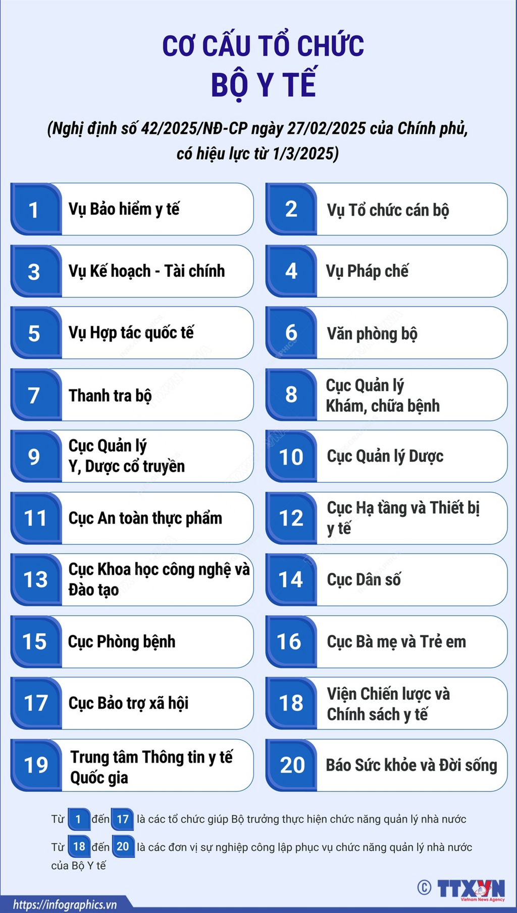 Chính phủ ban hành Nghị định số 42/2025/NĐ-CP ngày 27/2/2025 quy định chức năng, nhiệm vụ, quyền hạn và cơ cấu tổ chức của Bộ Y tế. Nghị định có hiệu lực thi hành từ ngày 1/3/2025.