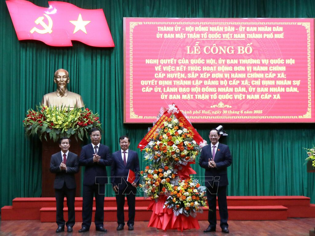 Tại buổi lễ, Phó Chủ tịch Quốc hội Trần Quang Phương đã trao Nghị quyết số 1675/NQ-UBTVQH15 ngày 16/6/2025 của Ủy ban Thường vụ Quốc hội về sắp xếp các đơn vị hành chính cấp xã của thành phố Huế. Theo đó, thành phố Huế sau khi sắp xếp, kết thúc hoạt động đơn vị hành chính cấp huyện sẽ có 40 đơn vị hành chính cấp xã, gồm: 21 phường và 19 xã. Trong đó, có 20 phường, 19 xã hình thành sau sắp xếp và 1 phường không thực hiện sắp xếp là phường Dương Nỗ. Tại lễ công bố cũng trao các quyết định thành lập Đảng bộ cấp xã, chỉ định nhân sự cấp ủy, lãnh đạo HĐND, UBND và Ủy ban MTTQ cấp xã.