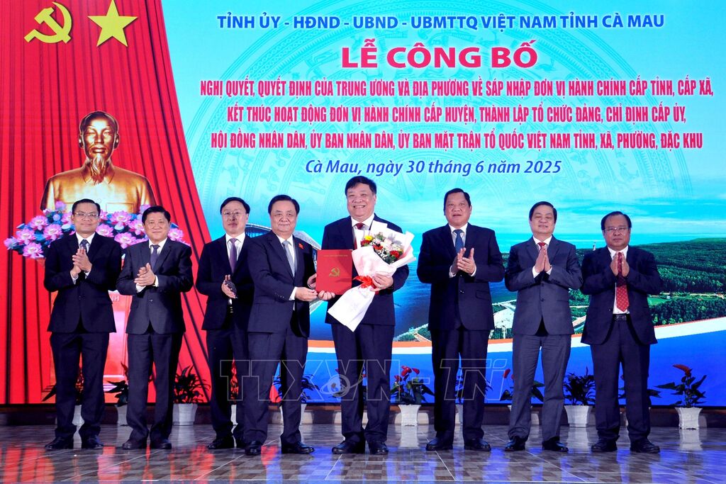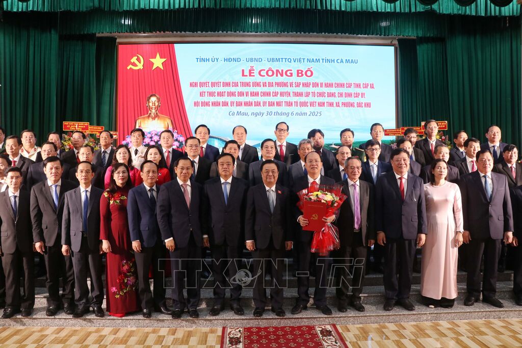 Hòa chung không khí của cả nước, Tỉnh ủy, HĐND, UBND, Ủy ban MTTQ Việt Nam tỉnh Cà Mau tổ chức Lễ công bố nghị quyết, quyết định của Trung ương và địa phương về sắp xếp đơn vị hành chính cấp tỉnh, cấp xã; kết thúc hoạt động đơn vị hành chính cấp huyện; thành lập tổ chức đảng; chỉ định cấp ủy đảng, HĐND, UBND, Ủy ban MTTQ Việt Nam tỉnh, xã, phường.