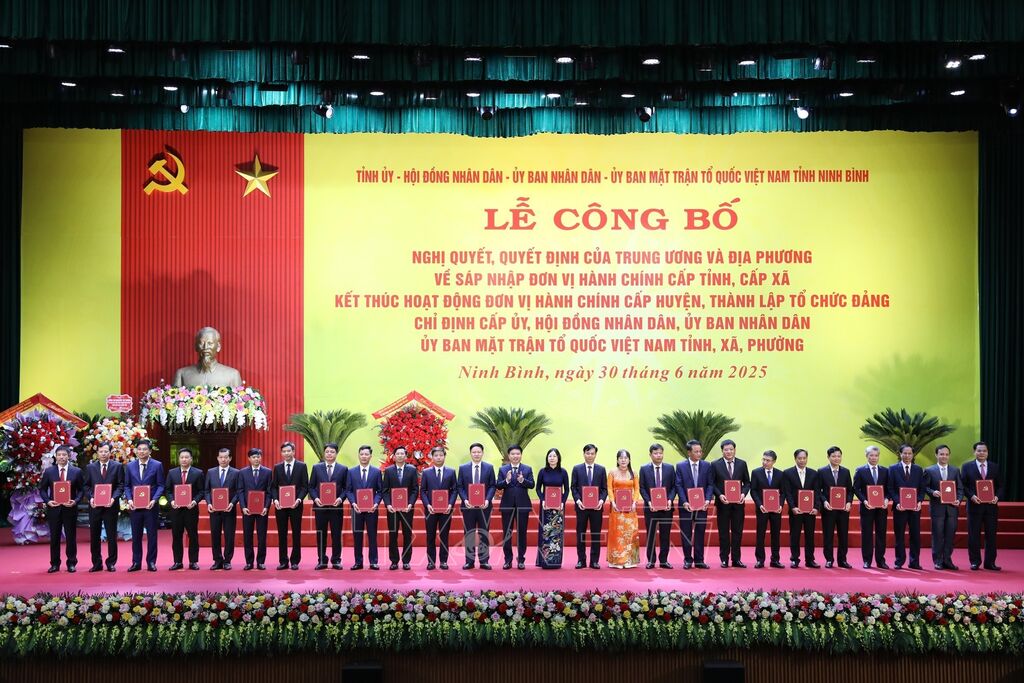 Ngày 30/6, Tỉnh ủy, HĐND, UBND, Ủy ban MTTQ Việt Nam tỉnh Ninh Bình long trọng tổ chức Lễ công bố Nghị quyết, Quyết định của Trung ương và địa phương về sáp nhập đơn vị hành chính cấp tỉnh, cấp xã, kết thúc hoạt động đơn vị hành chính cấp huyện, thành lập tổ chức Đảng, chỉ định cấp ủy, HĐND, UBND, Ủy ban MTTQ Việt Nam tỉnh, xã, phường. Chương trình được kết nối trực tuyến đến 129 điểm cầu xã, phường mới trong tỉnh. Đông đảo nhân dân háo hức đón thời khắc lịch sử và kỳ vọng tỉnh mới sẽ phát triển toàn diện, mang lại những tiện ích hành chính, thúc đẩy phát triển kinh tế-xã hội một cách đồng đều, bền vững hơn.