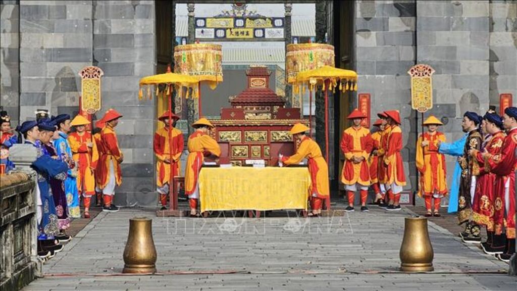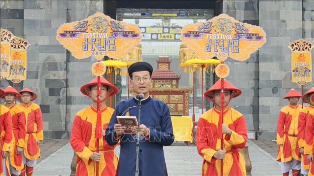 TTXVN - Sáng 1/1, tại Quảng trường Ngọ Môn, UBND tỉnh Thừa Thiên - Huế tổ chức chương trình Công bố Festival Huế 2024 và Lễ hội sân khấu hóa tái hiện Lễ Ban sóc triều Nguyễn.