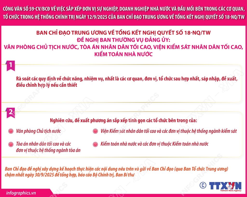 Tại Công văn số 59-CV/BCĐ về việc sắp xếp đơn vị sự nghiệp, doanh nghiệp nhà nước và đầu mối bên trong các cơ quan, tổ chức trong hệ thống chính trị ngày 12/9/2025, Ban Chỉ đạo Trung ương về tổng kết Nghị quyết số 18-NQ/TW đề nghị Ban Thường vụ Đảng ủy: Văn phòng Chủ tịch nước, Tòa án nhân dân tối cao, Viện Kiểm sát nhân dân tối cao, Kiểm toán nhà nước rà soát các quy định về chức năng, nhiệm vụ, nhất là các cơ quan, đơn vị, tổ chức sau hợp nhất, sáp nhập, đề xuất, điều chỉnh hợp lý nếu cần thiết; nghiên cứu, đề xuất phương án sắp xếp tinh gọn các tổ chức bên trong của Văn phòng Chủ tịch nước, Tòa án nhân dân tối cao và các đơn vị thuộc hệ thống ngành tòa án, Viện Kiểm sát nhân dân tối cao và các đơn vị thuộc hệ thống ngành kiểm sát, Kiểm toán nhà nước và các đơn vị thuộc Kiểm toán nhà nước./.