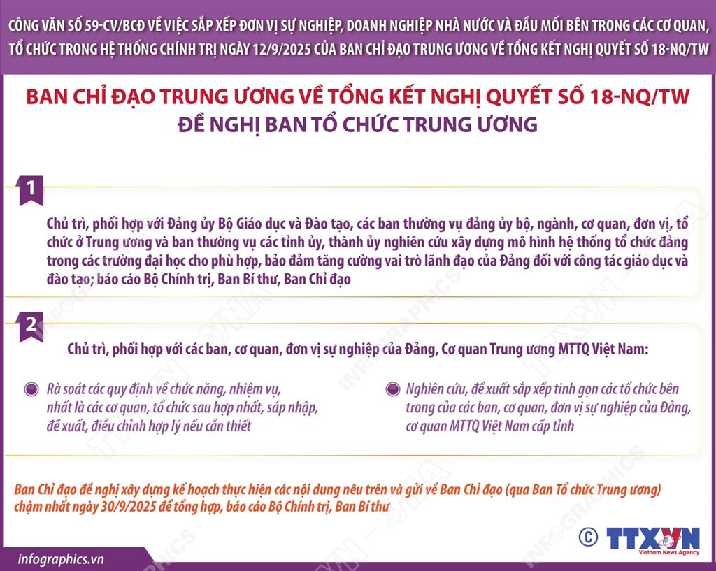 Tại Công văn số 59-CV/BCĐ về việc sắp xếp đơn vị sự nghiệp, doanh nghiệp nhà nước và đầu mối bên trong các cơ quan, tổ chức trong hệ thống chính trị ngày 12/9/2025, Ban Chỉ đạo Trung ương về tổng kết Nghị quyết số 18-NQ/TW đề nghị Ban Tổ chức Trung ương: (1) Chủ trì, phối hợp với Đảng ủy Bộ Giáo dục và Đào tạo, các ban thường vụ đảng ủy bộ, ngành, cơ quan, đơn vị, tổ chức ở Trung ương và ban thường vụ các tỉnh ủy, thành ủy nghiên cứu xây dựng mô hình hệ thống tổ chức đảng trong các trường đại học cho phù hợp, bảo đảm tăng cường vai trò lãnh đạo của Đảng đối với công tác giáo dục và đào tạo; báo cáo Bộ Chính trị, Ban Bí thư, Ban Chỉ đạo. (2) Chủ trì, phối hợp với các ban, cơ quan, đơn vị sự nghiệp của Đảng, Cơ quan Trung ương Mặt trận Tổ quốc Việt Nam rà soát các quy định về chức năng, nhiệm vụ, nhất là các cơ quan, tổ chức sau hợp nhất, sáp nhập, đề xuất, điều chỉnh hợp lý nếu cần thiết; nghiên cứu, đề xuất sắp xếp tinh gọn các tổ chức bên trong của các ban, cơ quan, đơn vị sự nghiệp của Đảng, cơ quan Mặt trận Tổ quốc Việt Nam cấp tỉnh./.