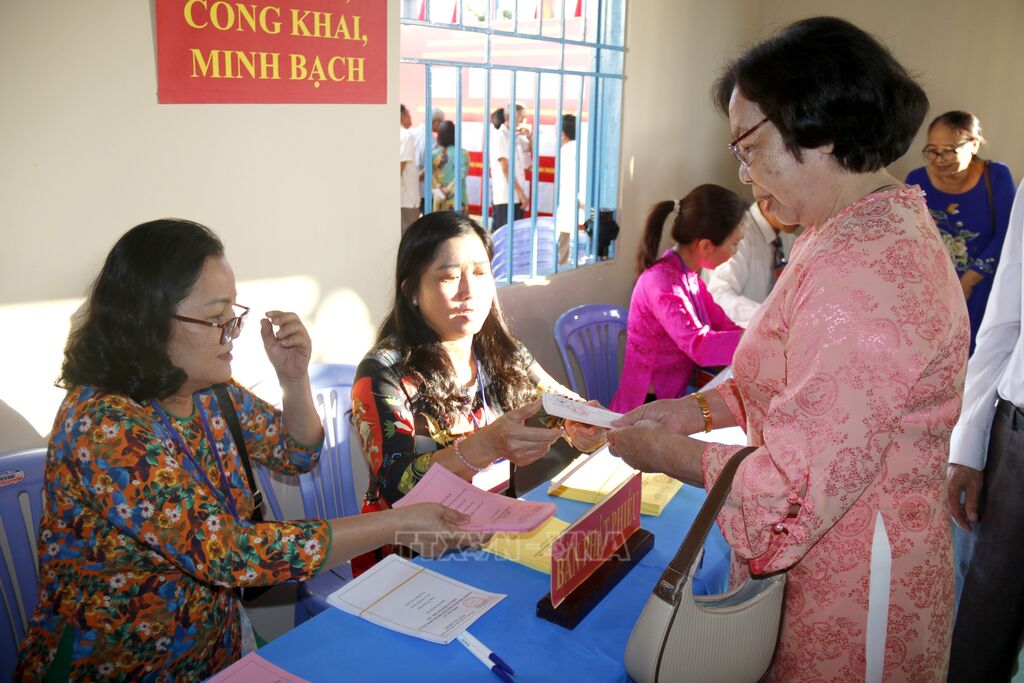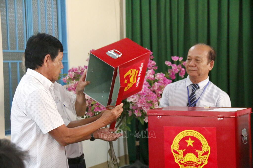 Các khu vực bỏ phiếu được trang trí trang nghiêm với cờ Tổ quốc, băng rôn, khẩu hiệu chào mừng ngày bầu cử. Tổ bầu cử phổ biến quy chế, hướng dẫn cử tri thực hiện quyền và nghĩa vụ công dân theo đúng trình tự.