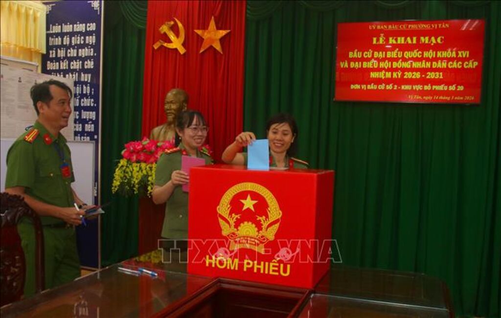 Tại một điểm khác là Tổ bầu cử số 20, phường Vị Tân, cử tri là lực lượng vũ trang Công an, Quân sự đóng quân trên địa bàn cũng đã thực hiện quy trình bỏ phiếu một cách khoa học và nghiêm cẩn. Thượng tá Ngô Tấn Hùng, Phó trưởng Công an phường Vị Tân, Tổ trưởng Tổ bầu cử số 20 nhấn mạnh yêu cầu cử tri phải thể hiện niềm tin và hy vọng của người làm chủ đất nước qua từng lá phiếu. Các quy định tại phòng bỏ phiếu được thực hiện nghiêm ngặt: cử tri xếp hàng lần lượt, giữ gìn trật tự, không vận động bầu cử tại chỗ và tuyệt đối không mang vũ khí, vật liệu nổ hay tài liệu có nội dung xấu độc vào khu vực bỏ phiếu. Những người không có nhiệm vụ không được vào phòng bỏ phiếu, trong khi các thành viên tổ chức bầu cử đeo phù hiệu đúng mẫu quy định để hướng dẫn và giải đáp thắc mắc cho cử tri.