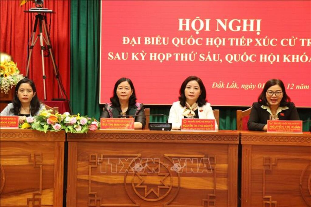 TTXVN - Ngày 1/12, Bí thư Trung ương Đảng, Trưởng Ban Dân vận Trung ương Bùi Thị Minh Hoài cùng Đoàn đại biểu Quốc hội tỉnh Đắk Lắk đã tiếp xúc cử tri tại tỉnh Đắk Lắk để thông báo kết quả Kỳ họp thứ 6, Quốc hội khóa XV và lắng nghe ý kiến, kiến nghị của cử tri. Hội nghị diễn ra trực tiếp tại thành phố Buôn Ma Thuột và trực tuyến tới điểm cầu các huyện M’đrắk, Ea Kar, Lắk, Krông Bông, Krông Ana.