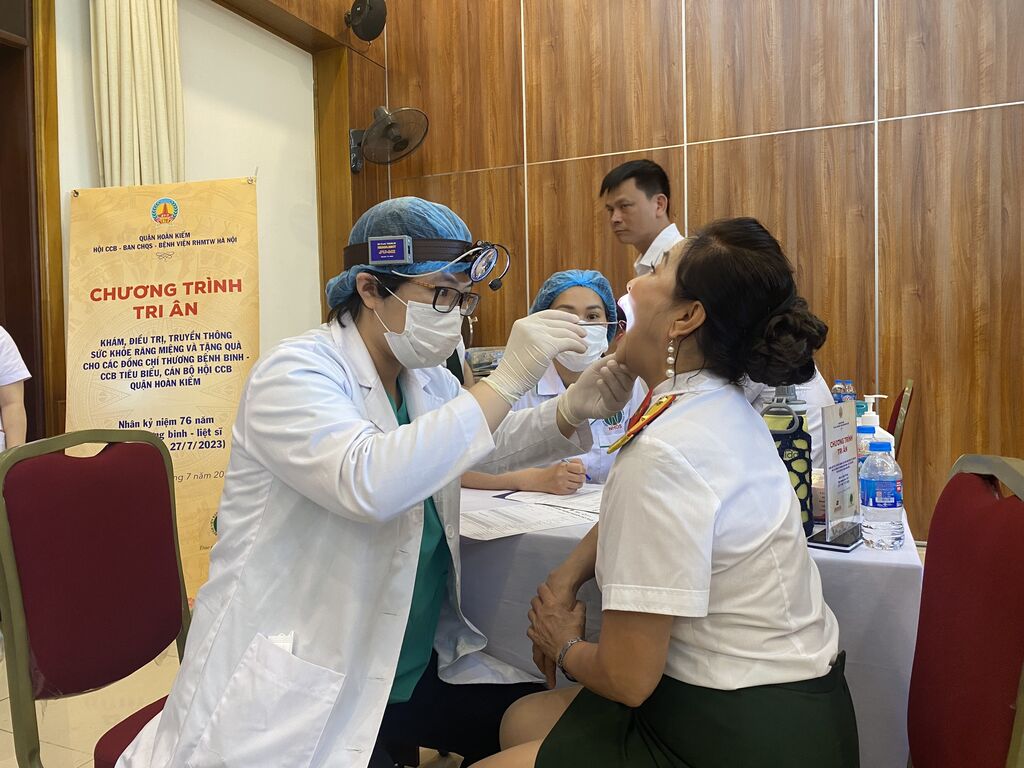 TTXVN - Ngày 7/7, Bệnh viện Răng Hàm Mặt Trung ương Hà Nội phối hợp với Hội Cựu chiến binh, Ban Chỉ huy Quân sự quận Hoàn Kiếm tổ chức chương trình khám, điều trị, truyền thông sức khỏe răng miệng và tặng quà cho các đồng chí thương binh, cựu chiến binh tiêu biểu, cán bộ Hội Cựu chiến binh quận Hoàn Kiếm, nhân kỷ niệm 76 năm Ngày Thương binh-Liệt sĩ (27/7/1947-27/7/2023).