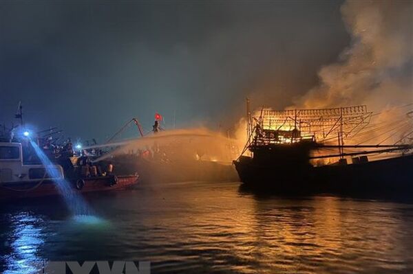 TTXVN - Đến hơn 18 giờ ngày 7/12, đám cháy lớn xảy ra tại khu vực neo đậu sửa chữa tàu cá (thuộc khu phố 2, phường Phú Hài, thành phố Phan Thiết, Bình Thuận) đã cơ bản được khống chế.