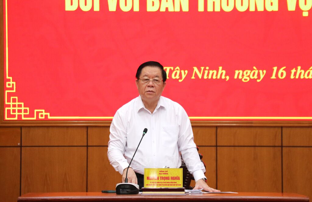 Đại tướng Nguyễn Trọng Nghĩa nhấn mạnh, Tây Ninh làm địa phương có vị trí địa lý và nhiều lợi thế phát triển, cần xây dựng các chương trình hành động cụ thể, tập trung các công trình trọng điểm để tạo đột phá, lấy đổi mới sáng tạo và khoa học, công nghệ làm động lực phát triển. Với nền tảng tăng trưởng khá tốt trong những năm qua, tỉnh có điều kiện thuận lợi để phấn đấu đạt mục tiêu tăng trưởng kinh tế hai con số, trở thành một cực tăng trưởng quan trọng của cả nước. Đại tướng Nguyễn Trọng Nghĩa cũng đề nghị tỉnh tiếp tục đẩy mạnh công tác xây dựng, chỉnh đốn Đảng, xây dựng hệ thống chính trị trong sạch, vững mạnh; tăng cường đấu tranh phòng, chống tham nhũng, lãng phí, tiêu cực; giữ vững an ninh chính trị, trật tự an toàn xã hội; nâng cao hiệu quả công tác kiểm tra, giám sát và phát huy vai trò giám sát, phản biện xã hội của Mặt trận Tổ quốc và các tổ chức chính trị – xã hội.