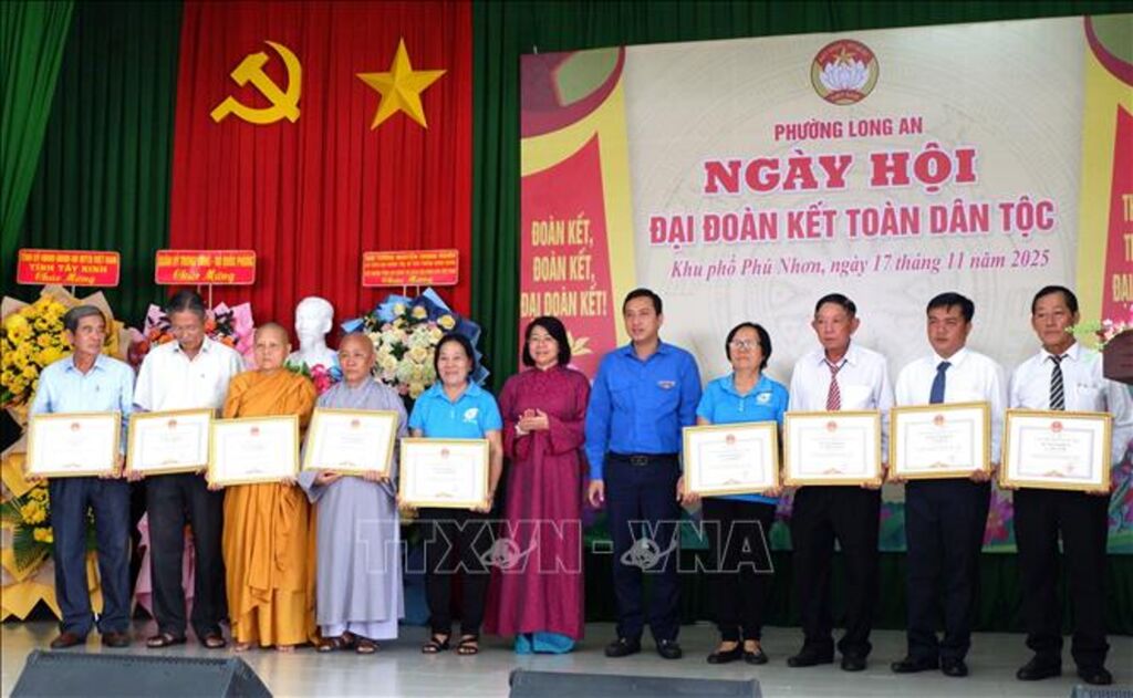 Dịp này, UBND tỉnh Tây Ninh tặng Bằng khen cho 10 cá nhân có thành tích xuất sắc trong việc thực hiện cuộc vận động Toàn dân đoàn kết xây dựng nông thôn mới, đô thị văn minh. Ủy ban Trung ương MTTQ Việt Nam trao 10 suất quà; Đại tướng Nguyễn Trọng Nghĩa và Đoàn công tác trao 200 suất quà cho các gia đình chính sách, hộ nghèo, cận nghèo và hộ bị ảnh hưởng bởi bão lũ. Tỉnh Tây Ninh cũng trao tặng 1 Nhà đại đoàn kết trị giá 80 triệu đồng cho hộ dân khu phố Phú Nhơn, phường Long An./.