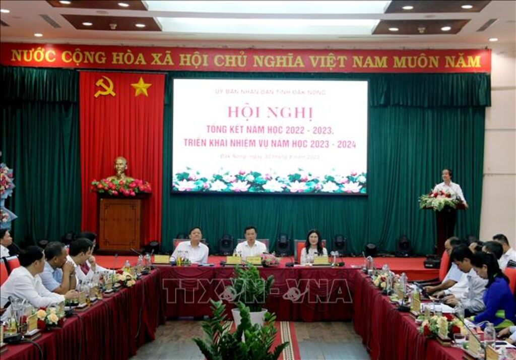 TTXVN - Ngày 30/8, Ủy ban nhân dân tỉnh Đắk Nông tổ chức hội nghị tổng kết năm học 2022-2023, triển khai nhiệm vụ năm học 2023-2024. Bộ trưởng Bộ Giáo dục và Đào tạo Nguyễn Kim Sơn và đoàn công tác của Bộ tham dự hội nghị.