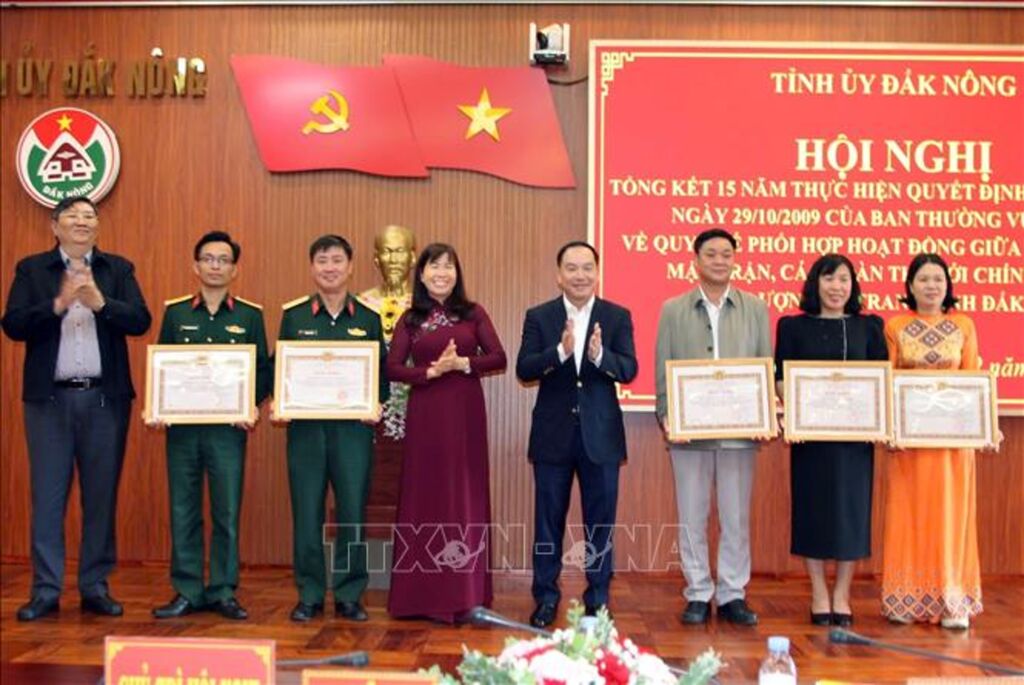 Tại hội nghị, Tỉnh ủy Đắk Nông đã tặng bằng khen cho 3 tổ chức đảng, 2 đảng viên có thành tích xuất sắc trong 15 năm thực hiện Quyết định số 1053 của Ban Thường vụ Tỉnh ủy về quy chế phối hợp hoạt động giữa Ban Dân vận, Mặt trận, các đoàn thể với chính quyền, lực lượng vũ trang tỉnh Đắk Nông./.