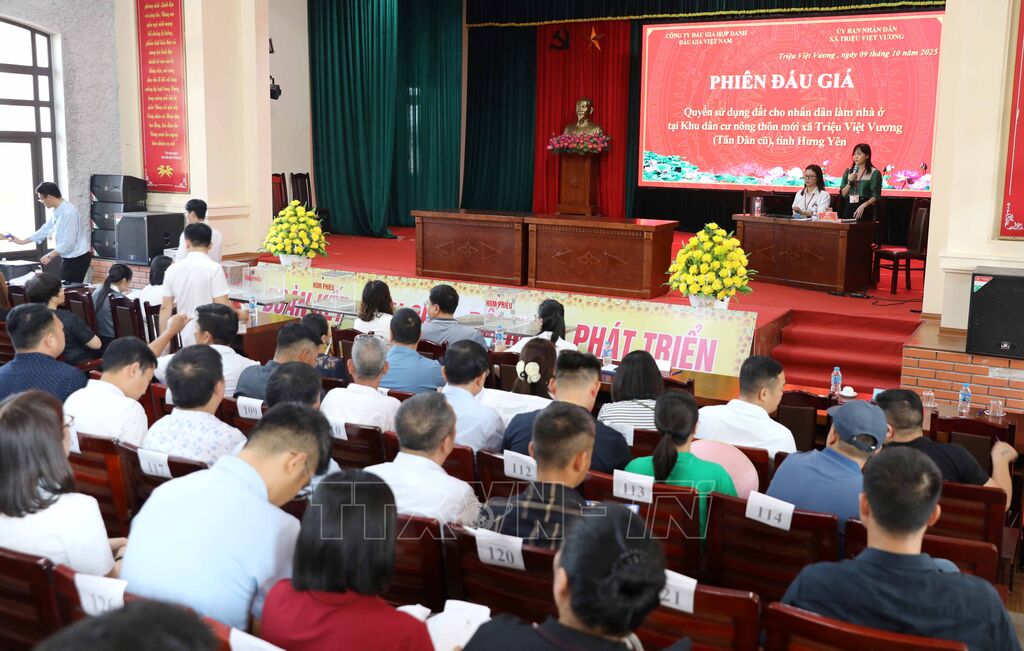 Sáng 9/10, xã Triệu Việt Vương (Hưng Yên) tổ chức đấu giá quyền sử dụng 33 lô đất cho người dân làm nhà ở tại khu dân cư mới (Khu Trạm tiếp sóng Đài phát thanh- truyền hình Hưng Yên cũ). Tổng giá khởi điểm của các ô đất trên là hơn 54 tỷ đồng. Diện tích các ô đất được mang ra đấu giá từ 68m2 đến hơn 100m2.