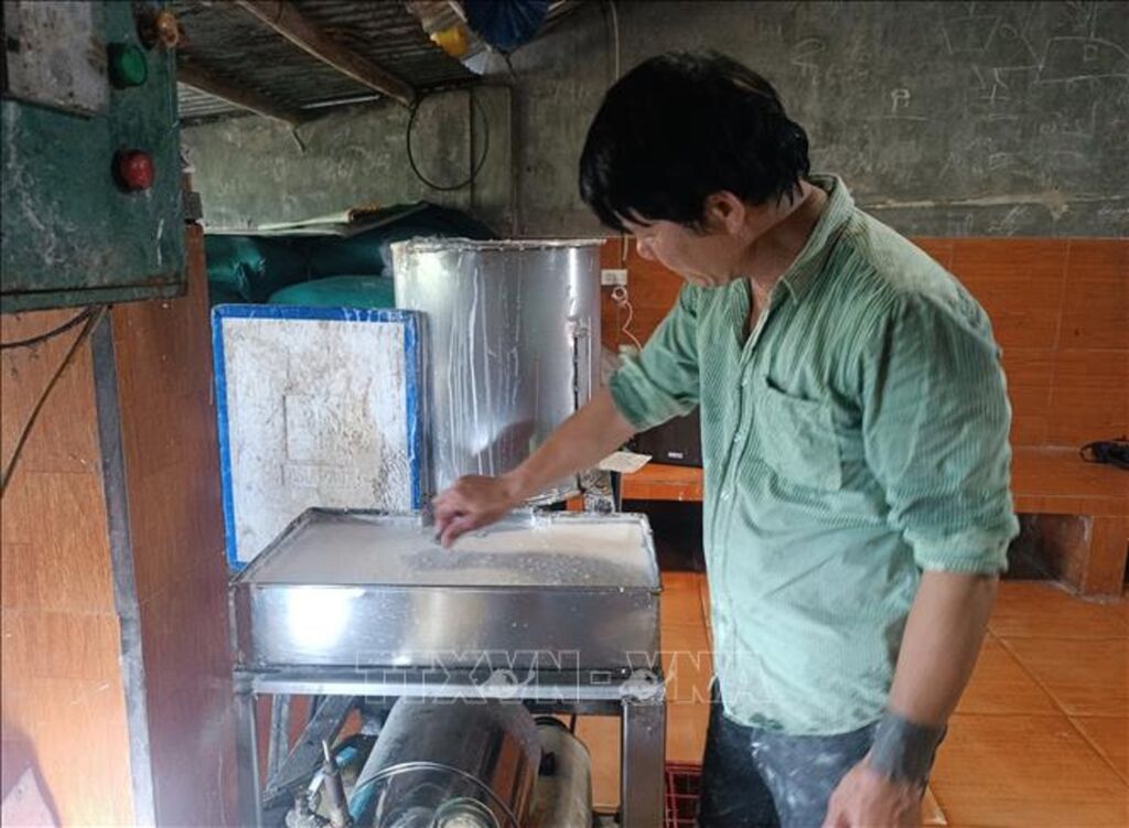 "Khoảng 16 năm nay, nghề làm bún có máy móc tham gia, thay thế sức lao động con người, sợi bún chạy một mạch dài và người làm bún phải ngắt. Khác ngày xưa, người làm bún phải đạp chày đè bột chạy ra khuôn, đi một mạch bún được xếp thành lọn riêng biệt, dân gian hay gọi là con bún; nay thì gọi là sợi bún", ông Hòa kể.