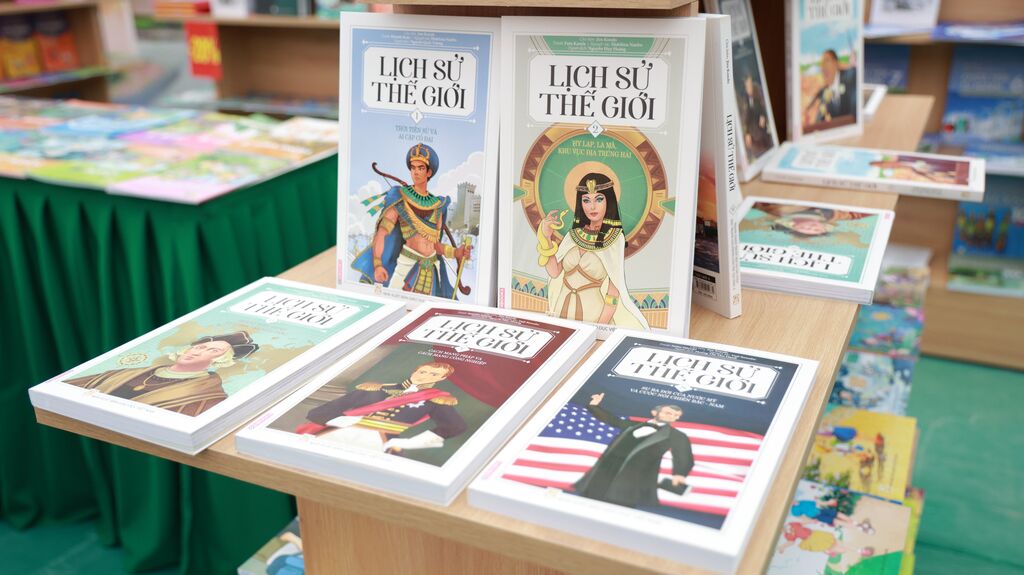 Khu bên trái giới thiệu hơn 2.000 sản phẩm giáo dục đặc trưng như sách bổ trợ, sách nâng cao, tài liệu học tốt, cùng nhiều bộ sách chuyên biệt. Trong đó có thể kể đến các bộ sách nổi bật như “Lịch sử thế giới bằng tranh” (12 tập, phong cách manga); “Global Math” và “Global Science” lớp 1–7 – học tiếng Anh qua Toán và Khoa học; “My Little Fun” – giáo trình tiếng Anh mầm non sinh động, hiện đại, giúp cha mẹ đồng hành cùng con trong hành trình học tập.
