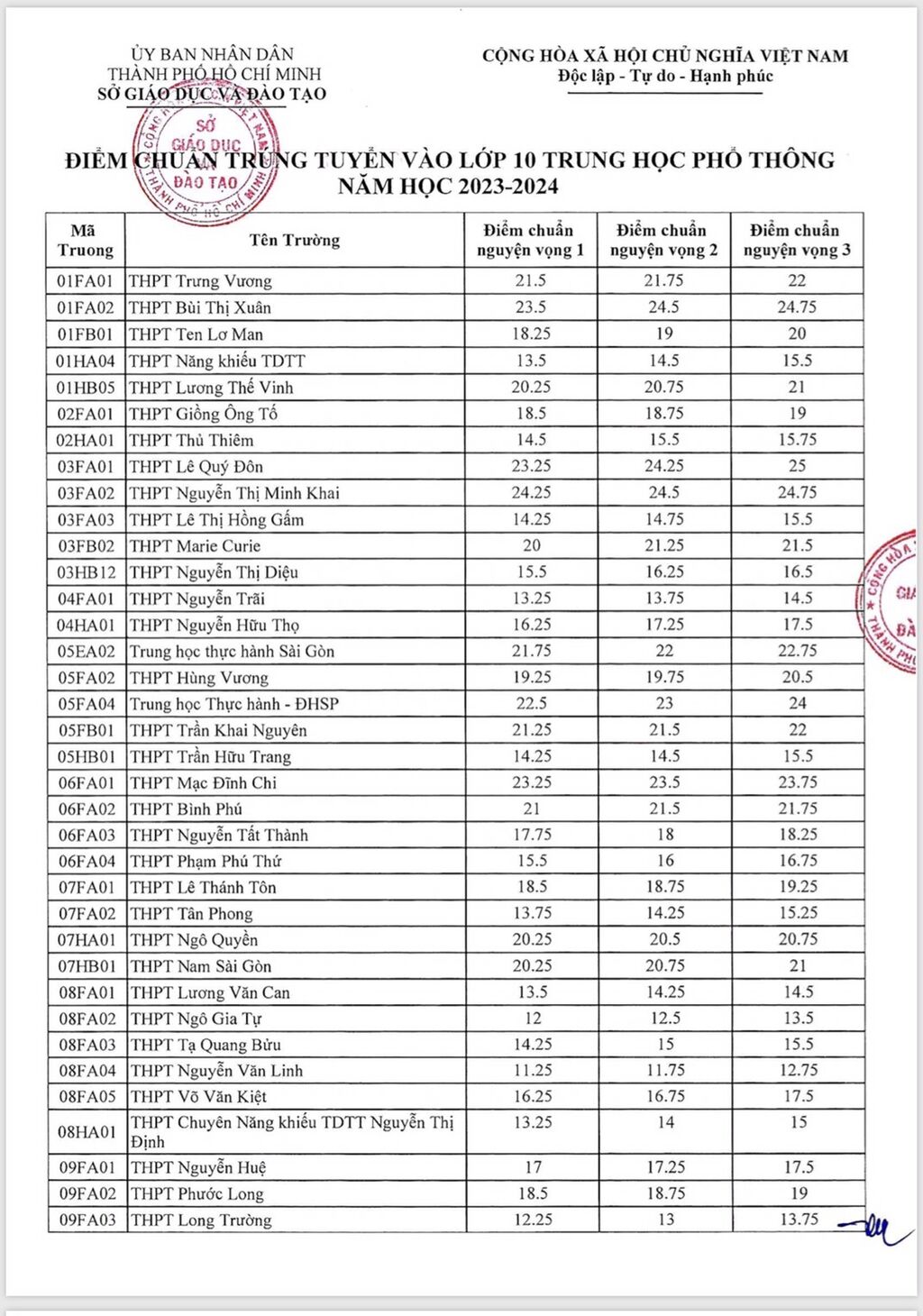 Kỳ thi tuyển sinh vào lớp 10 công lập năm học 2023-2024 tại Thành phố Hồ Chí Minh diễn ra trong hai ngày 6 và 7/6 với hơn 95.000 thí sinh dự thi. Tổng chỉ tiêu tuyển sinh lớp 10 của hơn 100 trường Trung học Phổ thông công lập của thành phố là khoảng 77.000 học sinh. Điểm xét tuyển vào lớp 10 là tổng điểm 3 môn thi, hệ số 1.