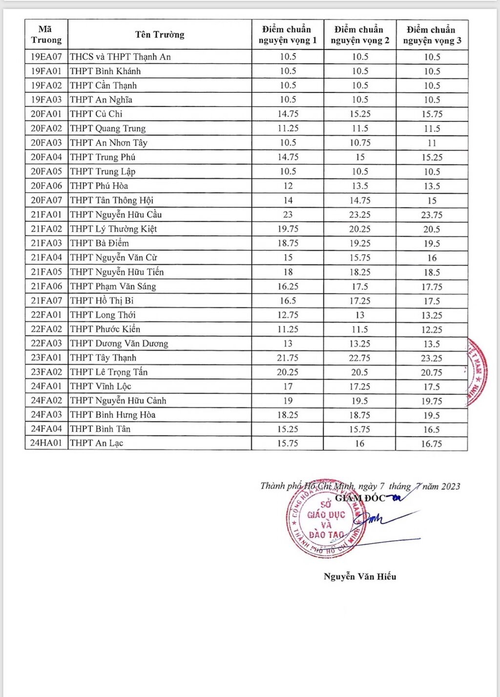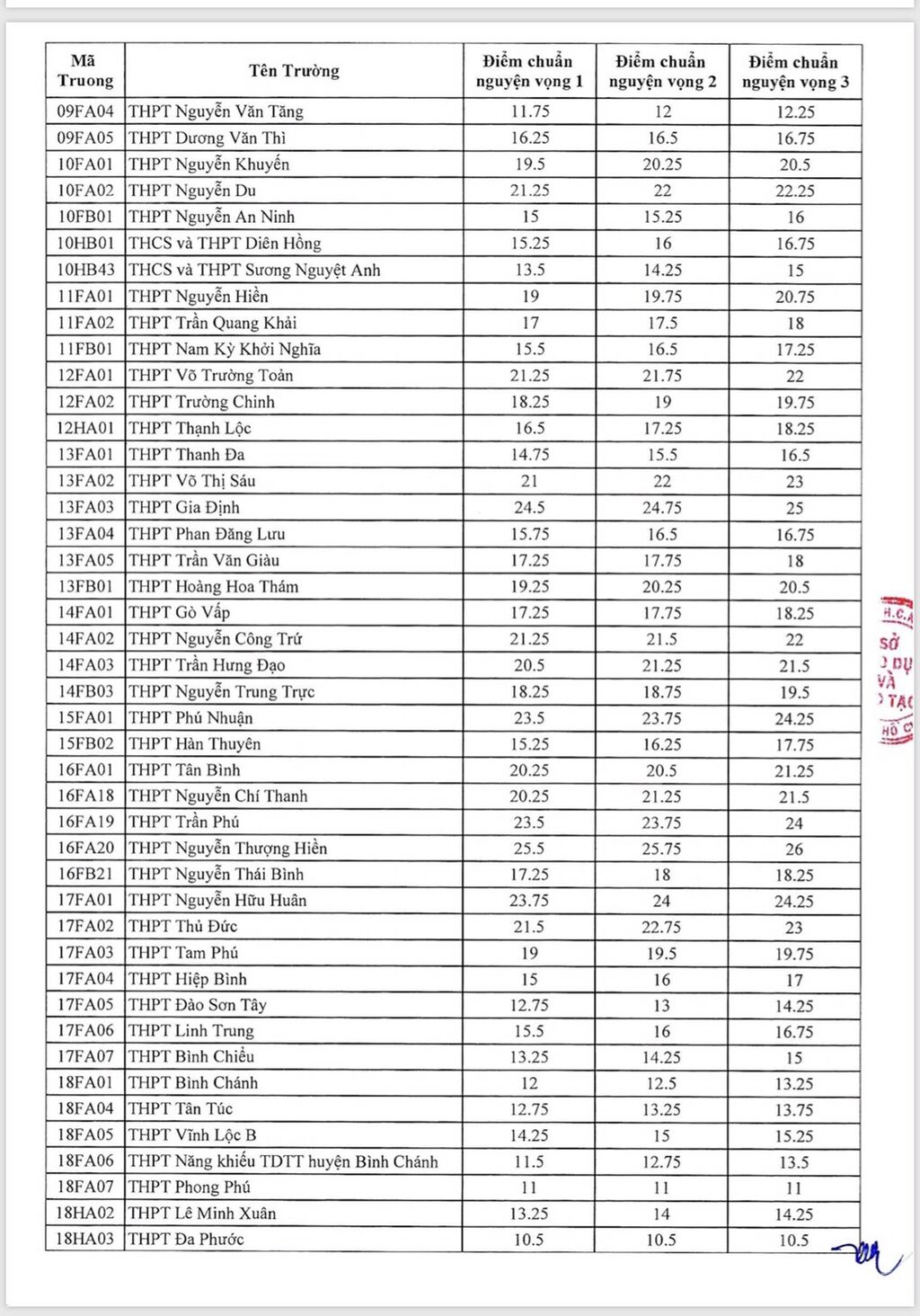 Như những năm trước, Trường Trung học Phổ thông Nguyễn Thượng Hiền vẫn dẫn đầu về điểm chuẩn với 25,5 điểm, tăng 1,25 điểm so với năm trước. Các trường có điểm chuẩn cao là Trường Trung học Phổ thông Gia Định 24,5 điểm, tăng 1,5 điểm; Trường Trung học Phổ thông Nguyễn Thị Minh Khai 24,25 điểm, tăng 1 điểm so với năm trước; Trường Trung học Phổ thông Nguyễn Hữu Huân 23,75 điểm, tăng 0,5 điểm; Trường Trung học Phổ thông Bùi Thị Xuân 23,5 điểm, tăng 1,25 điểm...