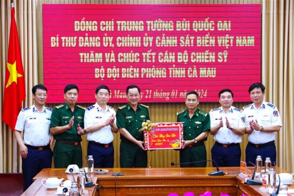 TTXVN - Chiều 21/1, Đoàn công tác Bộ Tư lệnh Cảnh sát Biển Việt Nam, do Trung tướng Bùi Quốc Oai - Bí thư Đảng ủy, Chính ủy Cảnh sát Biển Việt Nam làm Trưởng đoàn đã đến thăm, tặng quà cán bộ, chiến sĩ Bộ đội Biên phòng tỉnh Cà Mau nhân dịp Tết Giáp Thìn 2024.