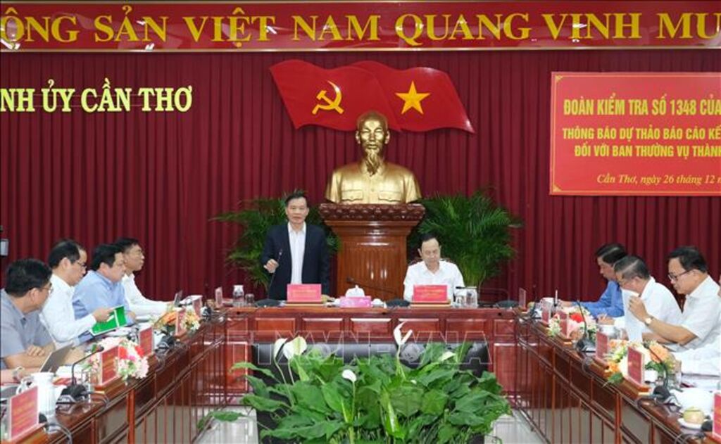 Chiều 26/12, tại thành phố Cần Thơ, Đoàn kiểm tra số 1348 của Bộ Chính trị do đồng chí Bùi Văn Thạch, Phó Chủ tịch chuyên trách Hội đồng Lý luận Trung ương, Phó trưởng đoàn dẫn đầu đã làm việc, thông báo Dự thảo báo cáo kết quả kiểm tra đối với Ban Thường vụ Thành ủy Cần Thơ.