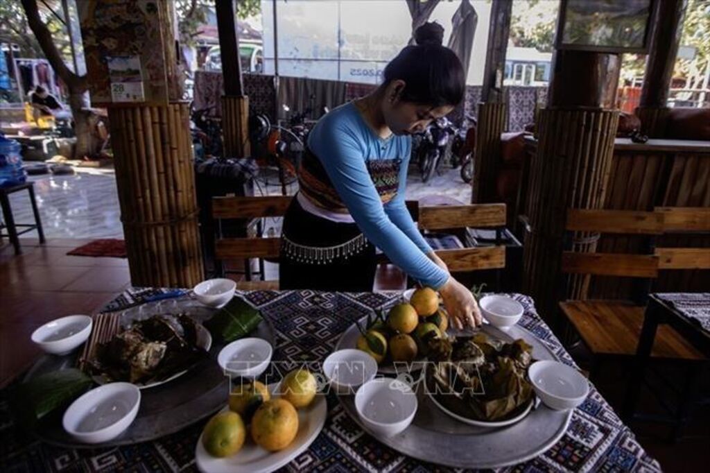Chị Lộc Thị Nha (xã Mai Châu) chia sẻ, cách chế biến cá trong lễ cơm mới mộc mạc nhưng tinh tế. Cá được làm thành hai món truyền thống - nướng và hấp. Cá nướng được ướp lá gừng giã nhuyễn, sả, ớt tươi, mắm, muối. Cá hấp được gói trong lá dong, buộc lạt giang, hấp trong khoảng một giờ – giữ nguyên mùi vị núi rừng, thơm nồng và mộc mạc như chính nếp sống của người Thái.
