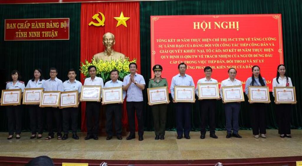 Sáng 24/10, tại thành phố Phan Rang - Tháp Chàm, Tỉnh ủy Ninh Thuận tổ Hội nghị tổng kết 10 năm thực hiện Chỉ thị số 35-CT/TW ngày 26/5/2014 của Bộ Chính trị về tăng cường sự lãnh đạo của Đảng đối với công tác tiếp công dân và giải quyết khiếu nại, tố cáo. Đồng thời, sơ kết 5 năm thực hiện Quy định số 11-QĐi/TW ngày 18/2/2019 của Bộ Chính trị về trách nhiệm của người đứng đầu cấp ủy trong việc tiếp dân, đối thoại trực tiếp và xử lý những phản ánh, kiến nghị của công dân.