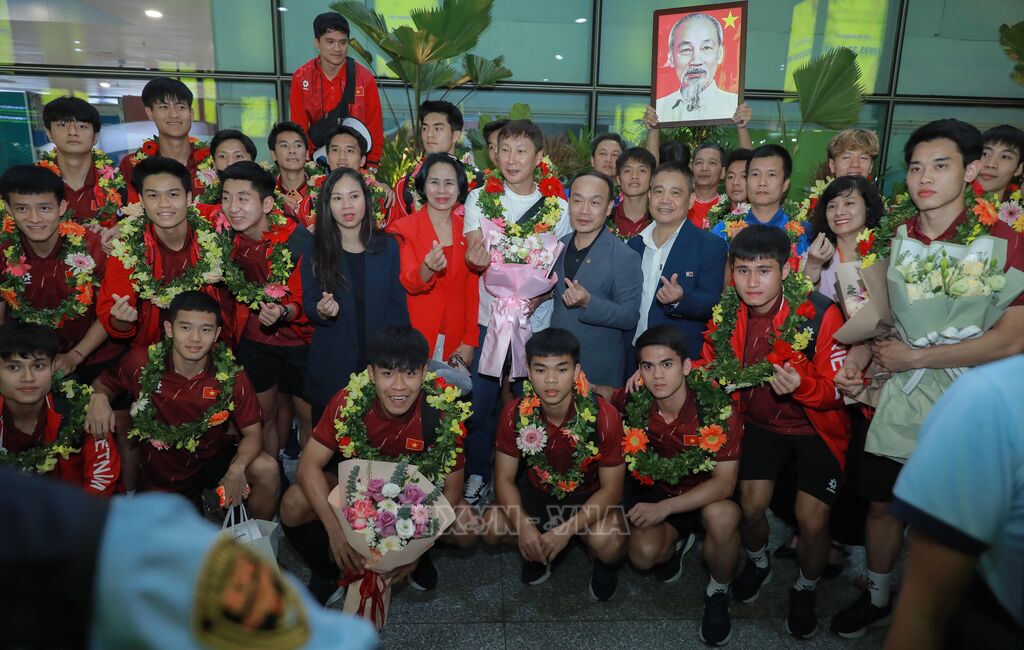 Đón đội tuyển tại sân bay có bà Lê Thị Hoàng Yến, Phó Cục trưởng Cục Thể dục Thể thao Việt Nam, ông Nguyễn Văn Phú - Tổng thư ký Liên đoàn Bóng đá Việt Nam cùng đông đảo người hâm mộ tới chúc mừng, chia sẻ niềm vui chiến thắng với các cầu thủ và Ban huấn luyện.