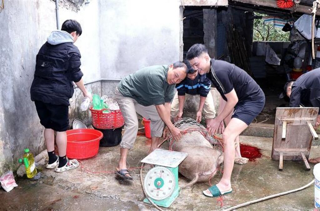 Để chuẩn bị thực phẩm cho mâm cỗ Tết, đồng bào thường mổ lợn, gà. Thịt lợn được chế biến thành nhiều món như thịt treo gác bếp, thịt luộc, canh xương... Việc mổ lợn còn là nghi thức báo với tổ tiên về việc gia đình bước sang năm mới.