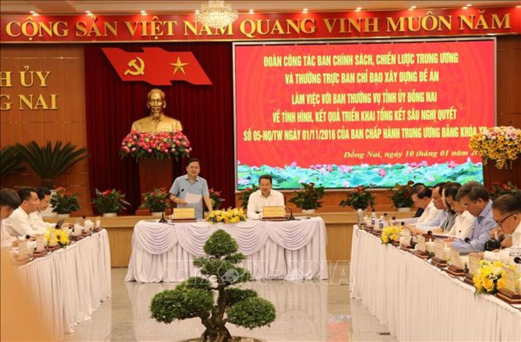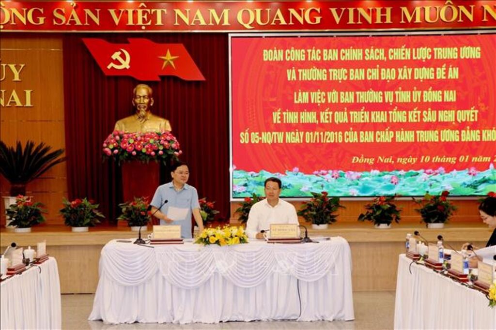 Ngày 10/1, Đoàn công tác Ban Chính sách, chiến lược Trung ương và Thường trực Ban Chỉ đạo xây dựng Đề án Các giải pháp chiến lược thúc đẩy tăng trưởng kinh tế “2 con số” trong kỷ nguyên mới – kỷ nguyên vươn mình của dân tộc Việt Nam, làm việc với Ban Thường vụ Tỉnh ủy Đồng Nai về tình hình, kết quả triển khai tổng kết sâu Nghị quyết số 05-NQ/TW ngày 01/11/2016 của Ban Chấp hành Trung ương Đảng khóa XII. Phó Trưởng Ban Chính sách, chiến lược Trung ương Nguyễn Anh Tuấn và Bí thư Tỉnh ủy Đồng Nai Vũ Hồng Văn chủ trì buổi làm việc.