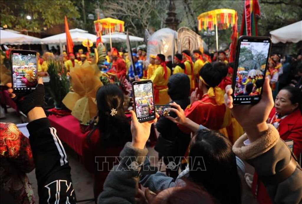Người dân hào hứng dùng điện thoại để livestream về hội Gióng. (Ảnh: Thanh Tùng/TTXVN)
