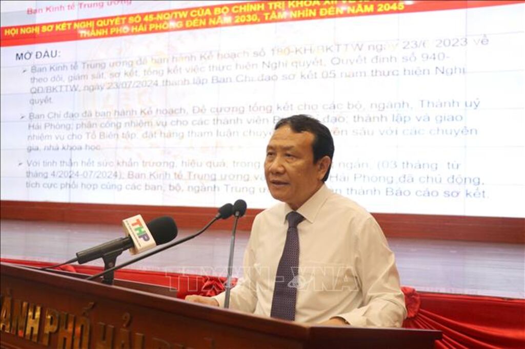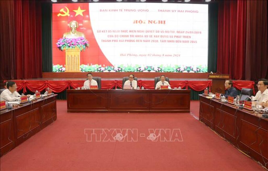 Hội nghị sơ kết 5 năm thực hiện Nghị quyết 45-NQ/TW, ngày 24/1/2019 của Bộ Chính trị khóa XII về xây dựng và phát triển thành phố Hải Phòng đến năm 2030, tầm nhìn đến năm 2045 đã được Ban Kinh tế Trung ương phối hợp với Thành ủy Hải Phòng tổ chức ngày 2/8.