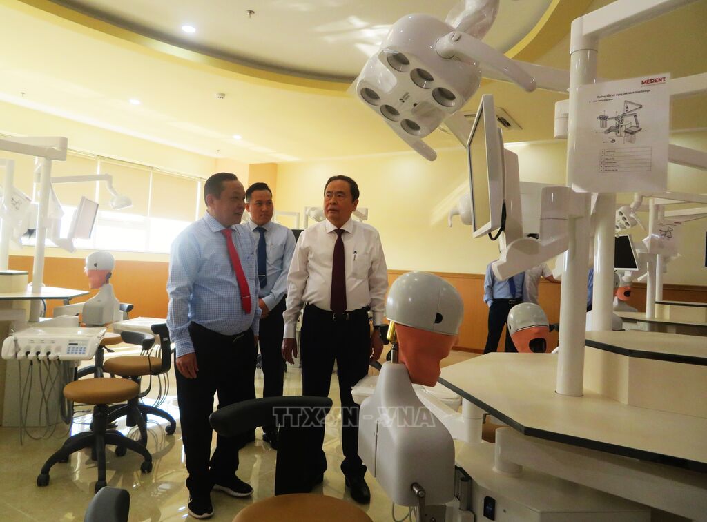 Để mô hình này đạt hiệu quả tối ưu, nhà trường thiết lập môi trường quốc tế bằng cách áp dụng mô hình đào tạo tiên tiến. Cụ thể như: Giáo trình chuẩn quốc tế, được cập nhật thường xuyên theo xu hướng phát triển của thế giới; giảng viên là chuyên gia trong nước và quốc tế, đến từ các quốc gia có nền giáo dục tiên tiến như Hoa Kỳ, Malaysia…; cơ sở vật chất hiện đại, bao gồm phòng học thông minh, các phòng thí nghiệm chuẩn quốc tế và đặc biệt là mô hình giải phẫu toàn thân SynDaver - công nghệ mô phỏng y học tiên tiến của Mỹ; chương trình giao lưu văn hóa, trao đổi sinh viên quốc tế, tạo điều kiện để sinh viên mở rộng mạng lưới kết nối và trải nghiệm môi trường học tập toàn cầu; cộng đồng sinh viên quốc tế đa dạng, giúp sinh viên rèn luyện khả năng giao tiếp liên văn hóa và thích nghi nhanh với môi trường đa ngôn ngữ, đa văn hóa. Quan trọng hơn, người học còn được thụ hưởng một môi trường học thuật thực chất, nơi tiếng Anh được sử dụng đa chiều từ lớp học, thư viện đến các hoạt động ngoại khóa, hội thảo và giao lưu quốc tế.