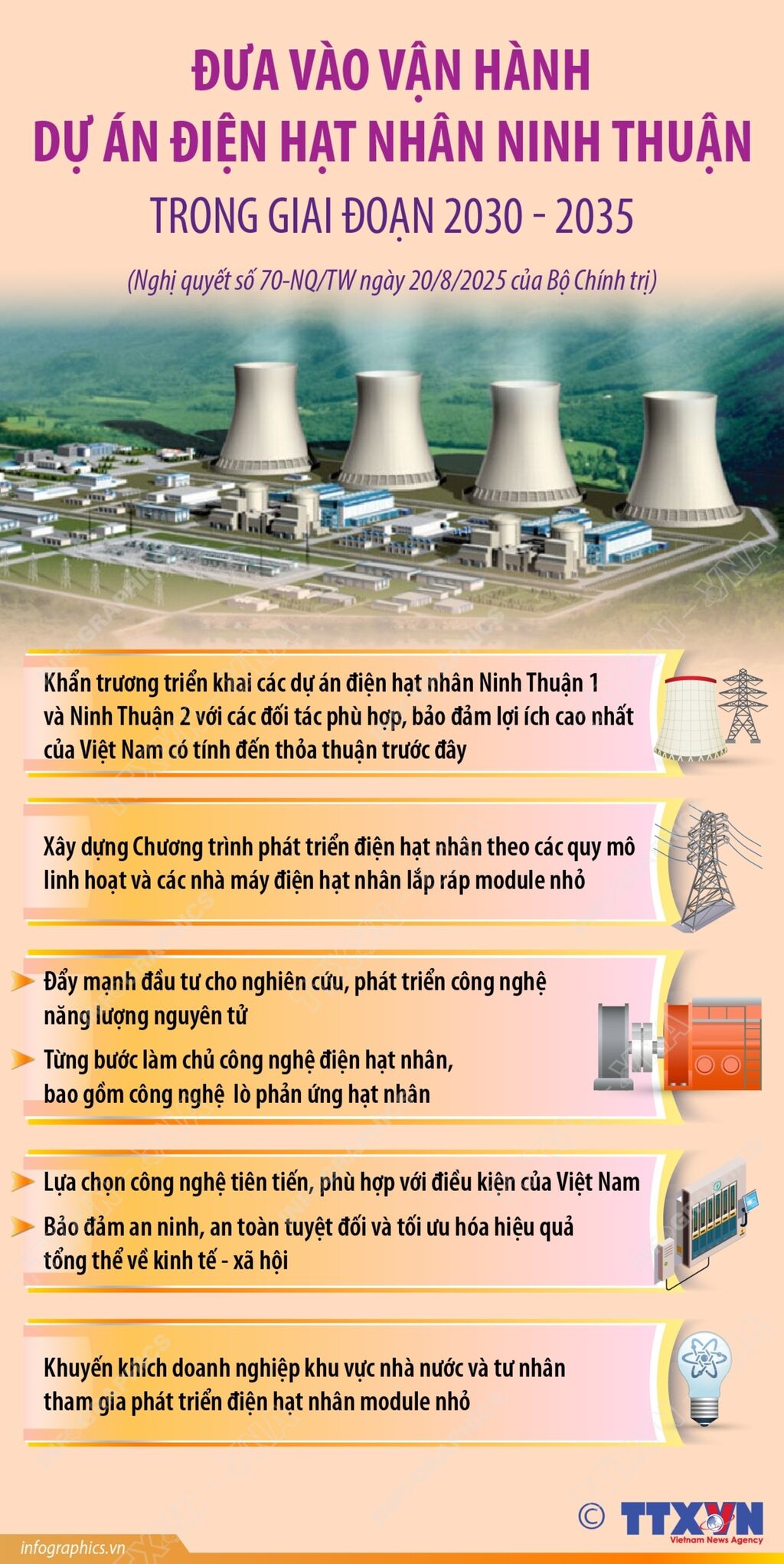 Đối với điện hạt nhân, Nghị quyết yêu cầu khẩn trương triển khai các dự án điện hạt nhân Ninh Thuận 1 và Ninh Thuận 2 với các đối tác phù hợp, bảo đảm lợi ích cao nhất của Việt Nam có tính đến thoả thuận trước đây, đưa vào vận hành trong giai đoạn 2030 - 2035. Xây dựng Chương trình phát triển điện hạt nhân theo các quy mô linh hoạt và các nhà máy điện hạt nhân lắp ráp module nhỏ; đẩy mạnh đầu tư cho nghiên cứu, phát triển công nghệ năng lượng nguyên tử, từng bước làm chủ công nghệ điện hạt nhân, bao gồm công nghệ lò phản ứng hạt nhân; lựa chọn công nghệ tiên tiến, phù hợp với điều kiện của Việt Nam, bảo đảm an ninh, an toàn tuyệt đối và tối ưu hóa hiệu quả tổng thể về kinh tế - xã hội…