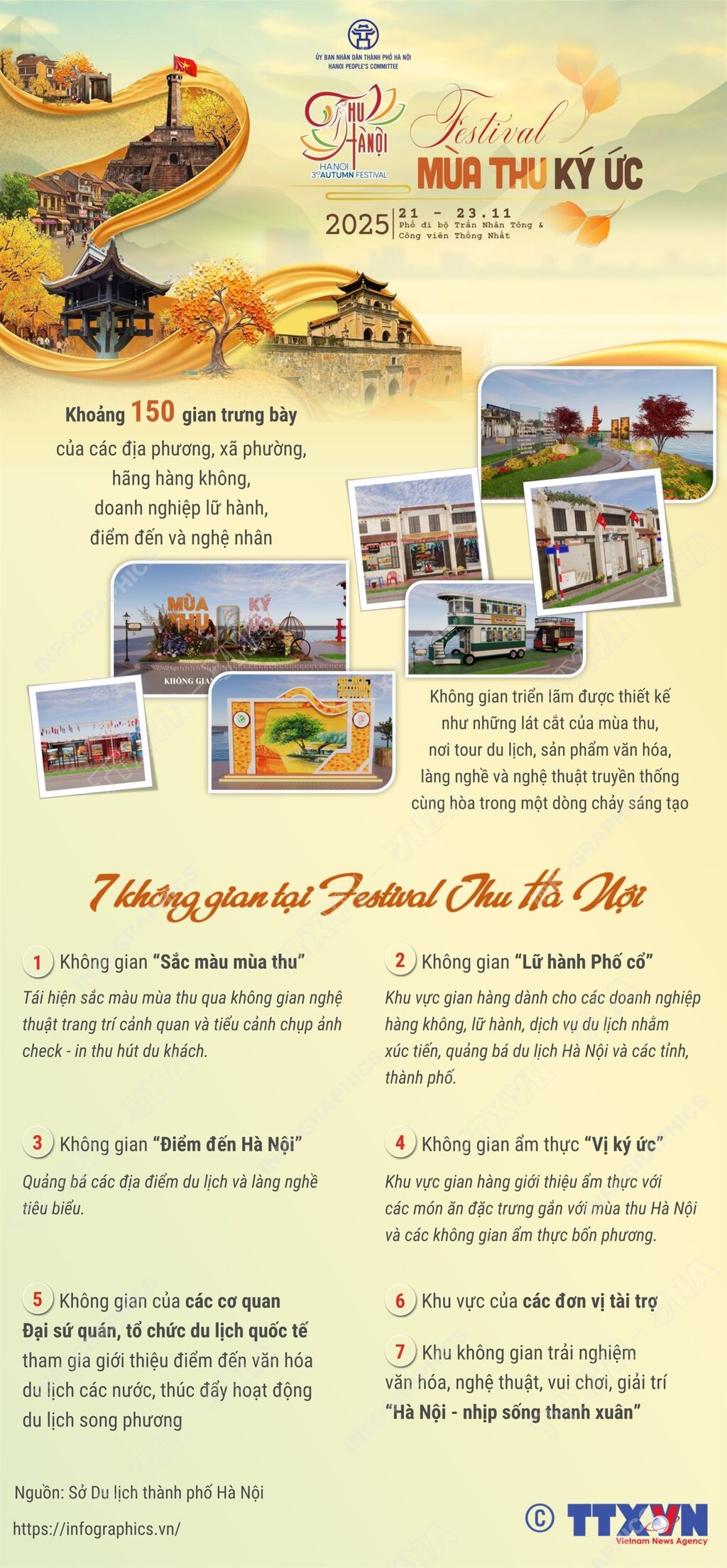 Sở Du lịch Hà Nội cho biết, Festival Thu Hà Nội lần thứ 3 năm 2025 diễn ra từ ngày 21 - 23/11/2025 tại phố đi bộ Trần Nhân Tông và Công viên Thống Nhất với chủ đề “Thu Hà Nội - Mùa thu ký ức”.