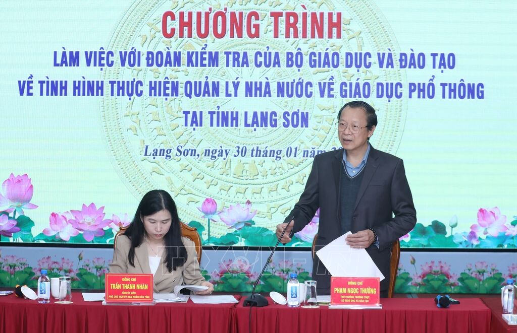 Chiều 30/1, tại buổi làm việc với lãnh đạo UBND tỉnh Lạng Sơn và đại diện các ngành liên quan của tỉnh, Thứ trưởng Thường trực Bộ Giáo dục và Đào tạo Phạm Ngọc Thưởng - Trưởng đoàn công tác của Bộ Giáo dục và Đào tạo, đề nghị, tỉnh Lạng Sơn đẩy nhanh tiến độ xây dựng, sớm hoàn thành đưa vào sử dụng các trường phổ thông nội trú liên cấp tiểu học và trung học cơ sở tại xã biên giới, tạo điều kiện học tập tốt nhất cho học sinh khu vực miền núi, biên giới.