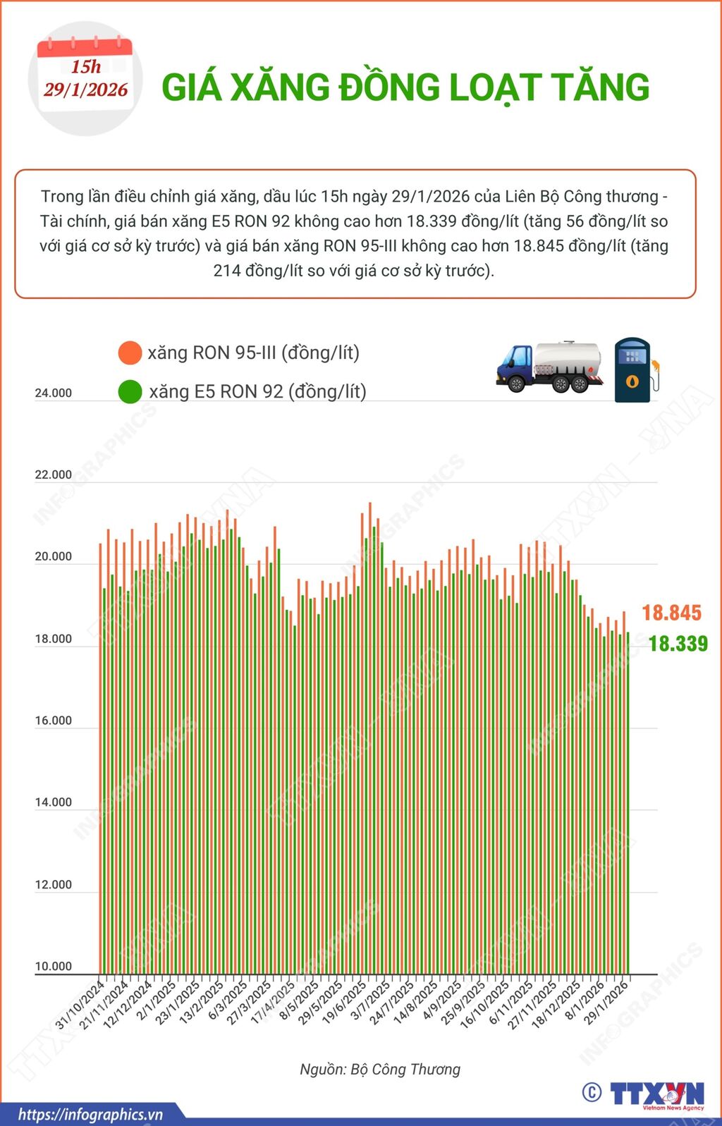 Trong lần điều chỉnh giá xăng, dầu lúc 15h ngày 29/1/2026 của Liên Bộ Công thương - Tài chính, giá bán xăng E5 RON 92 không cao hơn 18.339 đồng/lít (tăng 56 đồng/lít so với giá cơ sở kỳ trước) và giá bán xăng RON 95-III không cao hơn 18.845 đồng/lít (tăng 214 đồng/lít so với giá cơ sở kỳ trước).