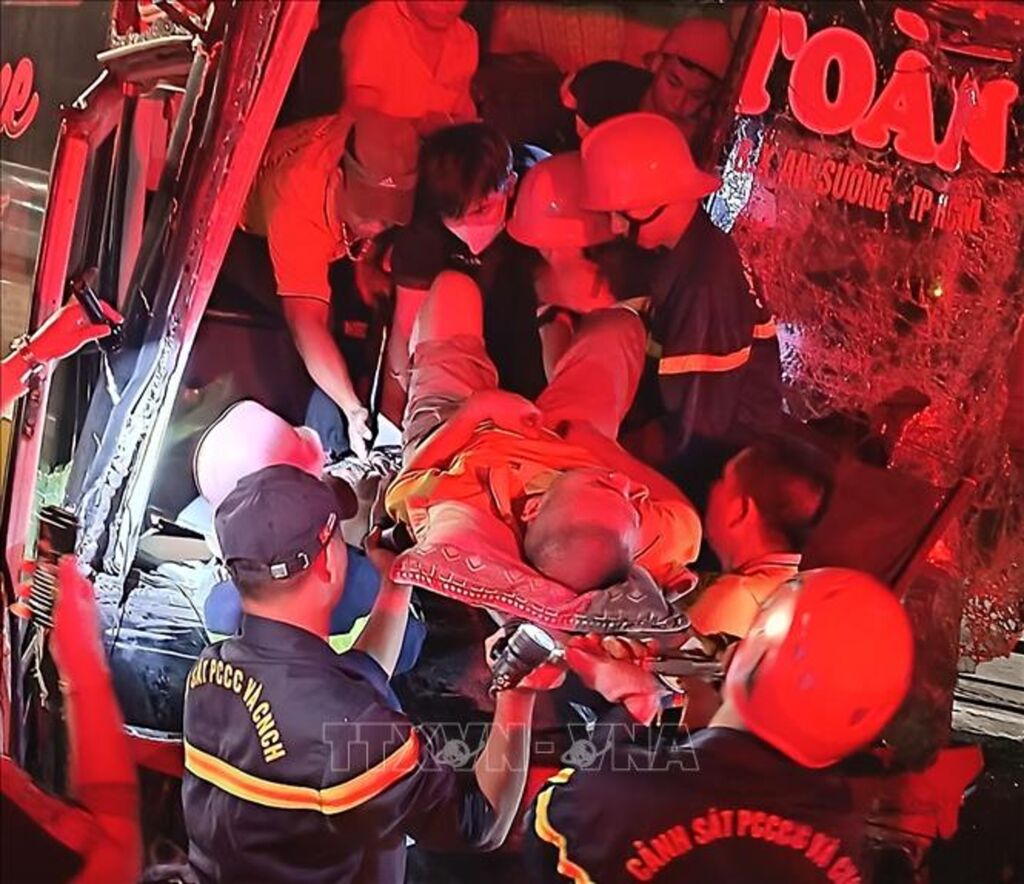 Giải cứu thành công tài xế xe khách mắc kẹt trong cabin sau va chạm với xe tải