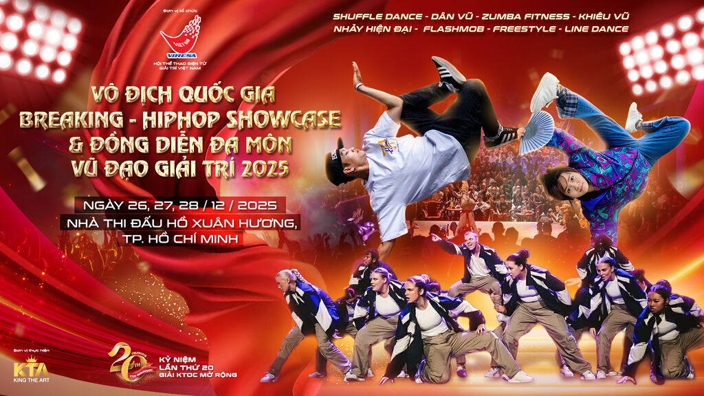Ngày 8/12, theo thông tin từ Hội Thể thao điện tử giải trí Việt Nam (VIRESA), Giải Vô địch quốc gia Breaking - HipHop Showcase và Đồng diễn đa môn vũ đạo giải trí 2025 sẽ được tổ chức tại Nhà thi đấu Hồ Xuân Hương (phường Xuân Hòa, Thành phố Hồ Chí Minh) từ ngày 26-28/12.
