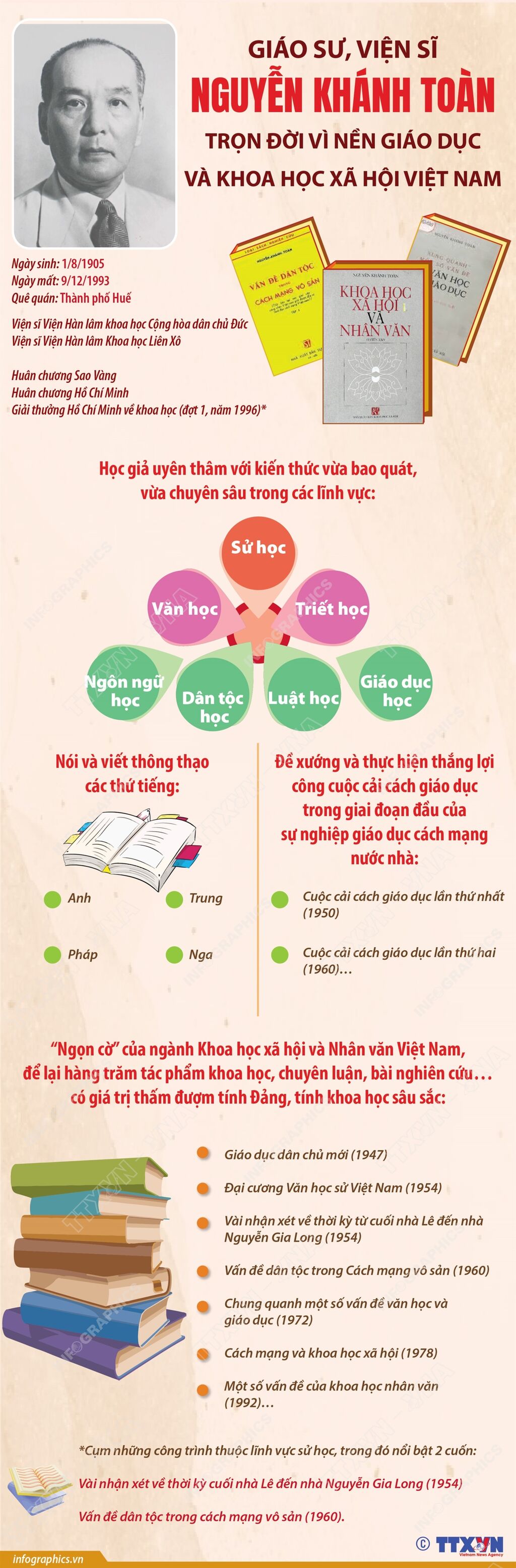 Năm 2008, ông được Nhà nước truy tặng Huân chương Sao Vàng. Giáo sư, Viện sĩ Nguyễn Khánh Toàn sinh ngày 1/8/1905, cách đây 120 năm.
