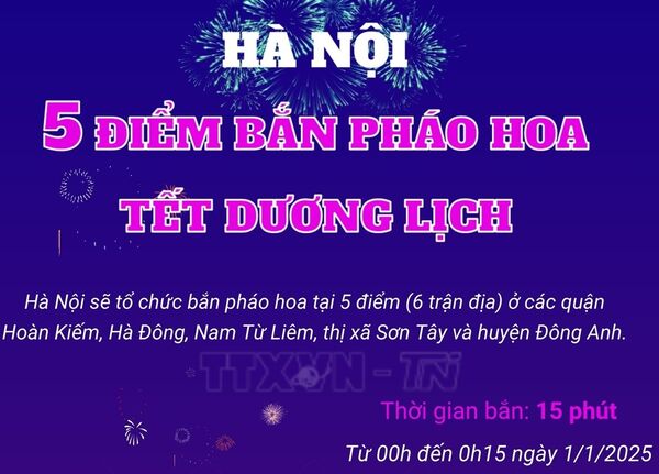 Trong khuôn khổ các hoạt động chào mừng Kỷ niệm 80 năm Cách mạng tháng tám (19/8/1945 - 19/8/2025) và Quốc khánh (2/9/1945-2/9/2025), UBND thành phố Hà Nội phối hợp với các đơn vị tổ chức bắn pháo hoa tại 5 điểm vào tối 2/9, gồm: Hồ Hoàn Kiếm, Công viên Thống nhất, hồ Văn Quán, Sân vận động quốc gia Mỹ Đình và hồ Tây theo hình thức truyền thống và pháo hoa nghệ thuật.