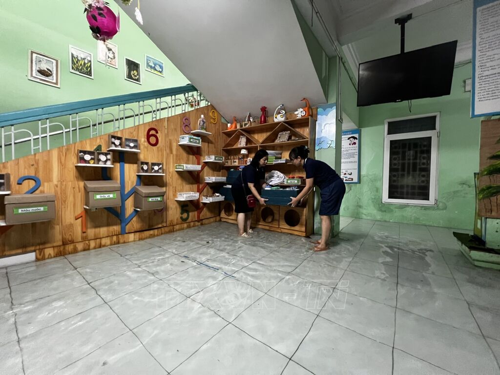 Cùng với việc duy trì hoạt động dạy học, công tác dọn dẹp, rà soát hạ tầng và thiết bị, bảo đảm an toàn cơ sở vật chất cũng được các trường triển khai đồng bộ. Tại Trường Mầm non Trung Hòa (phường Yên Hòa), một số phòng học, làm việc và khu vực bếp ăn bị ảnh hưởng do ngập nước. Nhà trường đã khẩn trương di dời, kê cao thiết bị, đồ dùng, đồ chơi nhằm hạn chế hư hỏng. Sở Giáo dục và Đào tạo Hà Nội lưu ý nhà trường tiếp tục rà soát, khơi thông dòng nước, vệ sinh môi trường kỹ lưỡng sau khi nước rút để sẵn sàng đón trẻ trở lại trường.