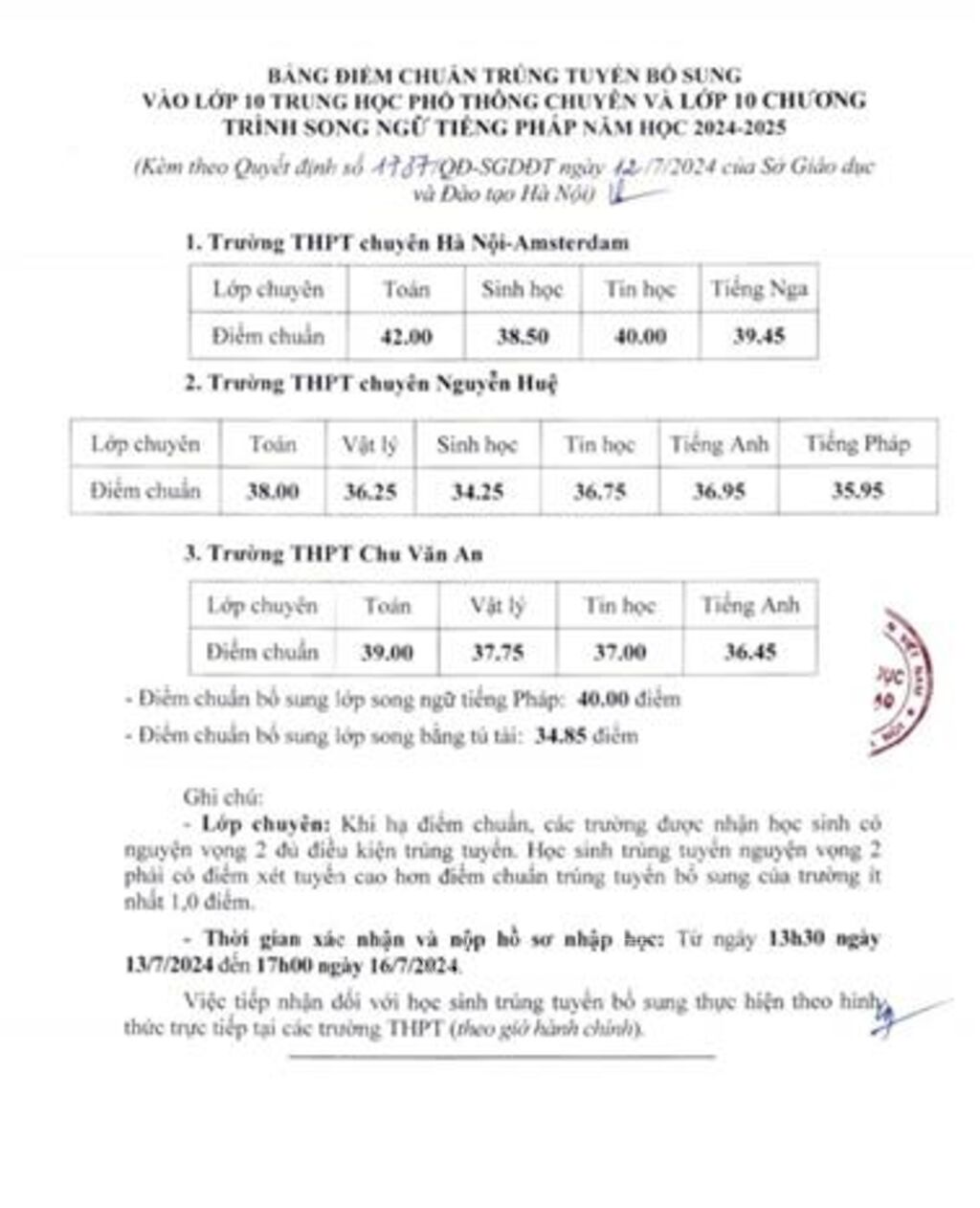 Sở Giáo dục và Đào tạo Hà Nội vừa ban hành Quyết định số 1737/QĐ-SGDĐT ngày 12/7/2024 phê duyệt điểm chuẩn trúng tuyển bổ sung vào lớp 10 Trung học phổ thông chuyên, lớp 10 song ngữ tiếng Pháp và lớp 10 chương trình thí điểm song bằng tú tài năm học 2024-2025.