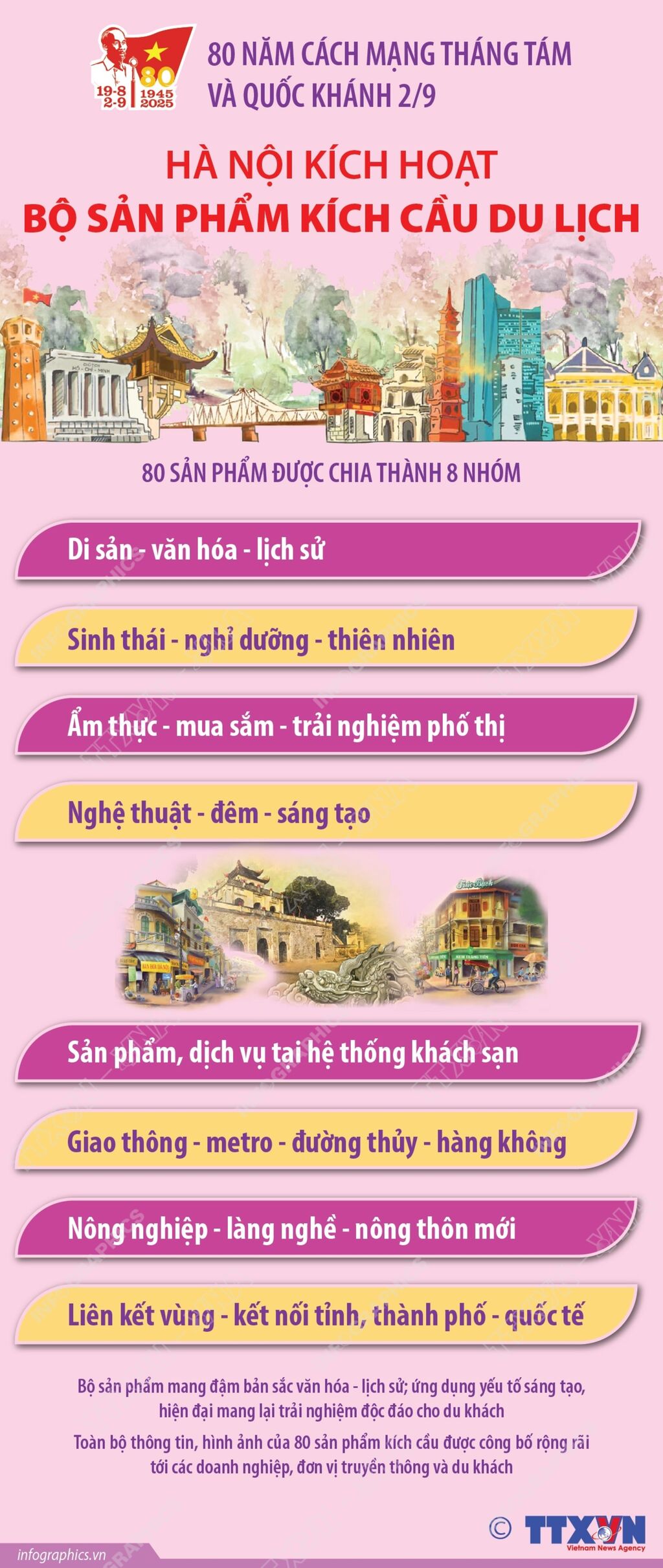 Để tạo thêm sức hút cho du lịch Thủ đô, chào mừng 80 năm Cách mạng Tháng Tám thành công (19/8/1945 - 19/8/2025) và Quốc khánh nước CHXHCN Việt Nam (2/9/1945 - 2/9/2025), ngành du lịch Hà Nội kích hoạt bộ sản phẩm kích cầu gồm 80 sản phẩm, chương trình mới, mang đậm bản sắc văn hóa - lịch sử, đồng thời ứng dụng yếu tố sáng tạo, hiện đại mang lại trải nghiệm độc đáo cho du khách./.