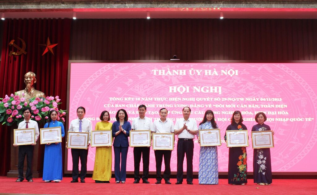 Tại Hội nghị, Ban Thường vụ Thành ủy Hà Nội đã tặng Bằng khen 10 tập thể và 9 cá nhân đã có thành tích xuất sắc trong 10 năm thực hiện Nghị quyết số 29-NQ/TW./.